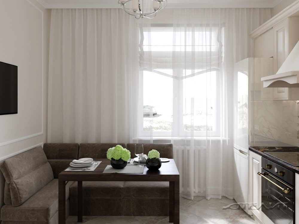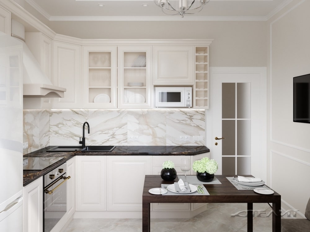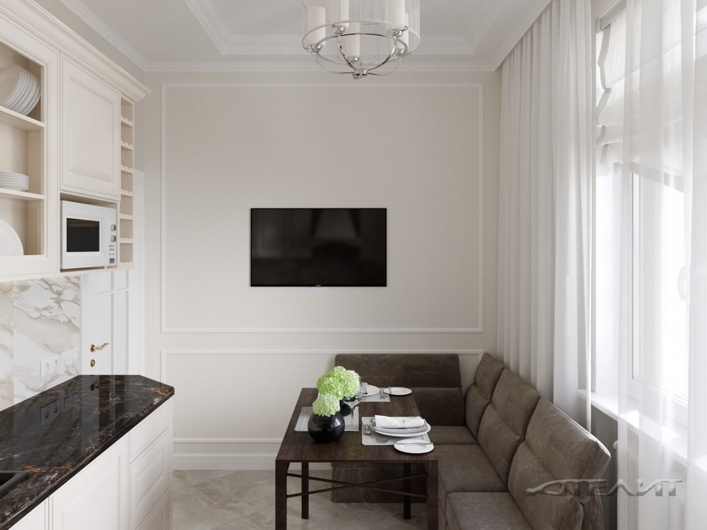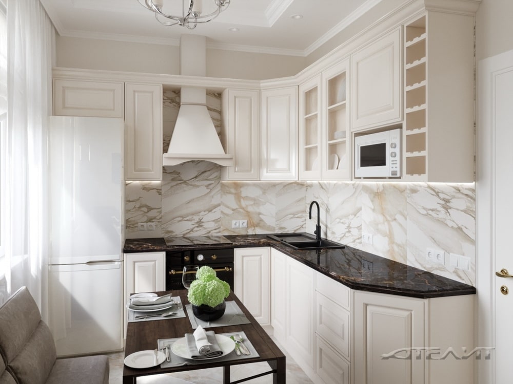 Комната оформлена под светлый мрамор, с которыми контрастирует темная столешница и стол. Несмотря на небольшую площадь, дизайнеры смогли компактно и без ущерба удобству разместить здесь угловой диван и столик. При необходимости они выполняют роль обеденного гарнитура. Кухня оснащена встраиваемой техникой.