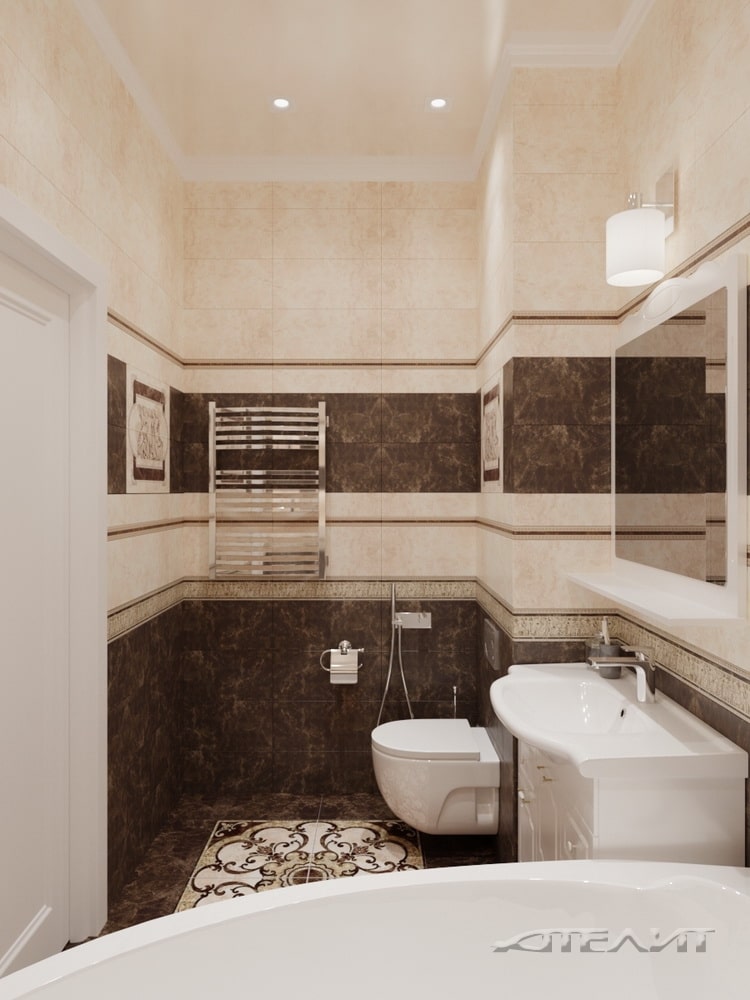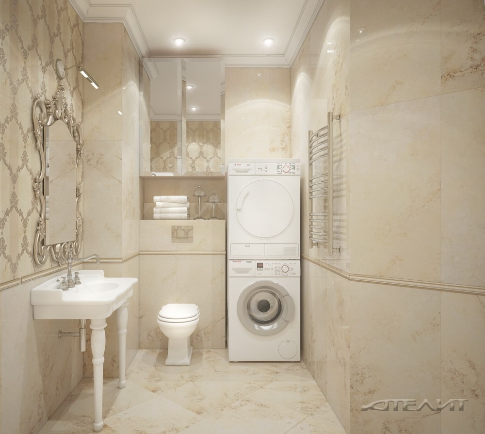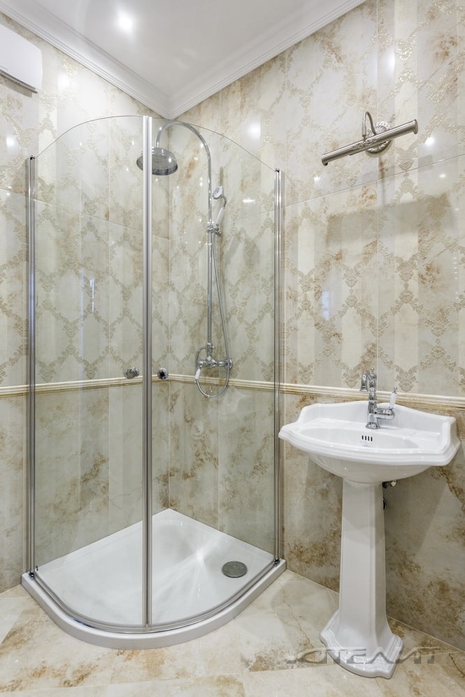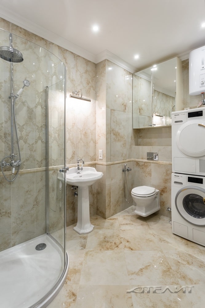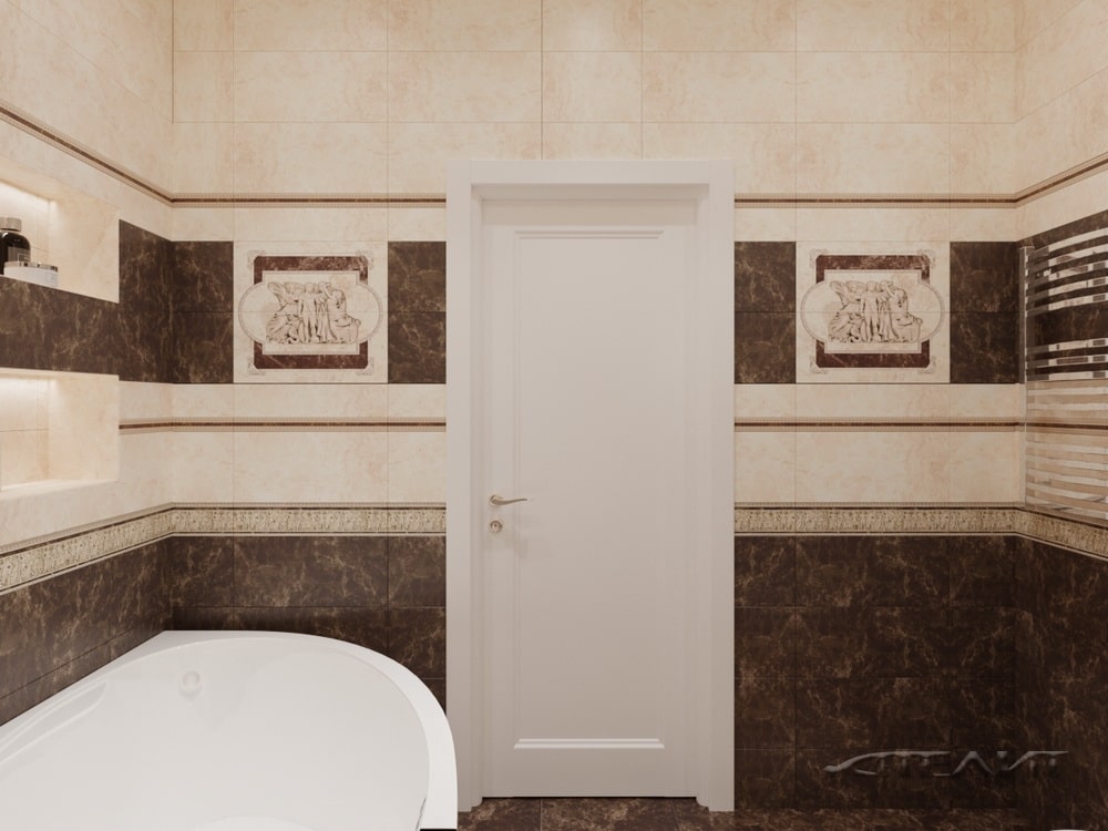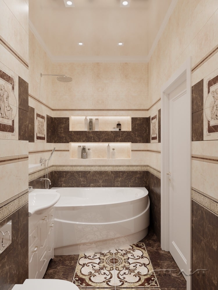 Комната оформлена в классическом стиле с флером античности, на что намекают горизонтальные полоски с орнаментом и плитка с мраморным рисунком. Для экономии пространства здесь разместили угловую ванную, а полки для косметики оборудовали в подсвечиваемых нишах стены.