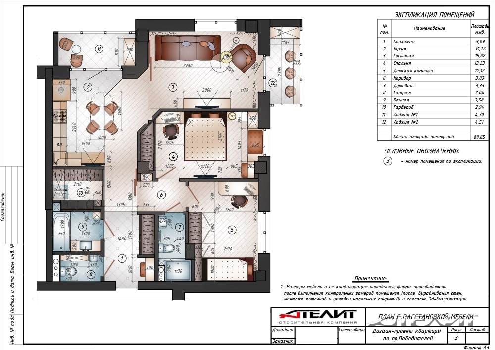 Трехкомнатная квартира с двумя лоджиями площадью 89,56 м²