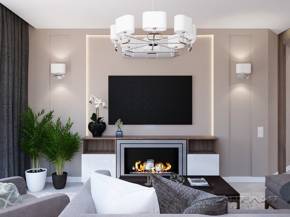 Помещение оформлено современном стиле с элементам классики и модерна. Центральное место отведено зоне просмотра ТВ, что подчеркнуто размещением люстры и контурным освещением стены, на которой закреплена ЖК-панель. Основная роль комнаты — служить местом отдыха и общения, поэтому под телевизором размещен искусственный камин.