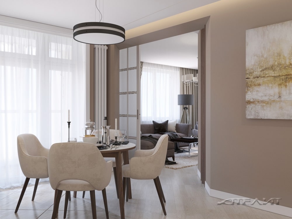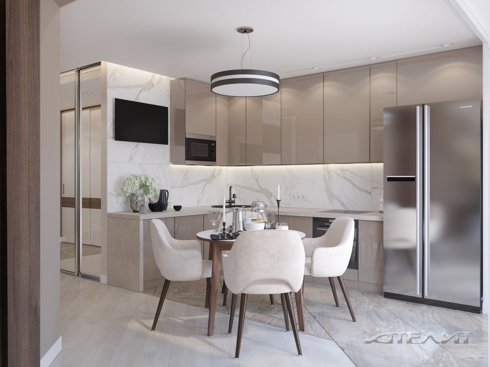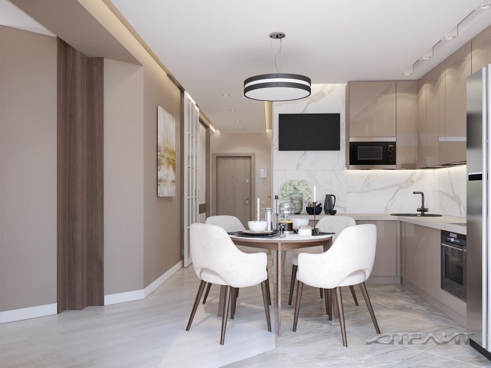 Помещение оформлено в кофейных тонах, благодаря чему служит органичным продолжением гостиной. Уни удачно дополнены крупной плиткой под мрамор. Здесь размещен компактный кухонный гарнитур. Напольное покрытие разного цвета и фактуры помогает зрительно разделить зону готовки и столовую.