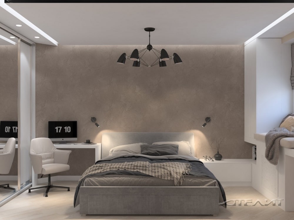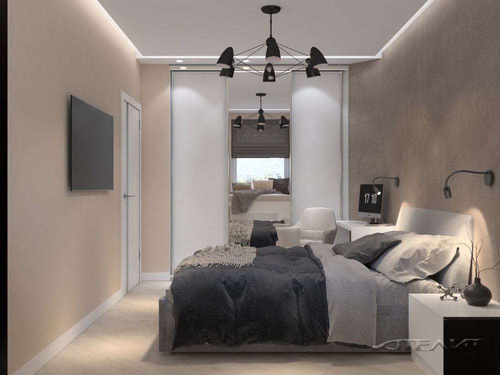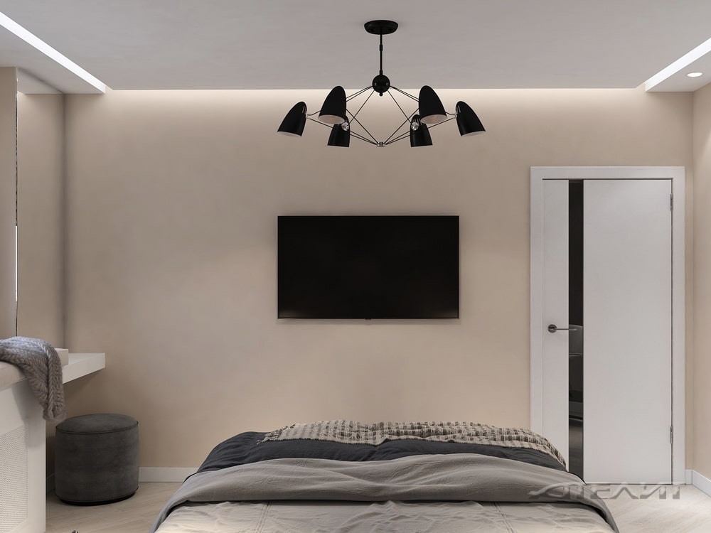 В оформлении использованы теплые бежево-серые тона, которые в сочетании с направленным освещением создают камерную обстановку, располагающую к отдыху. Акцентными элементами служат черные плафоны люстры, бра и декоративная вставка в межкомнатной двери. Для хранения вещей предусмотрен вместительный шкаф-купе.