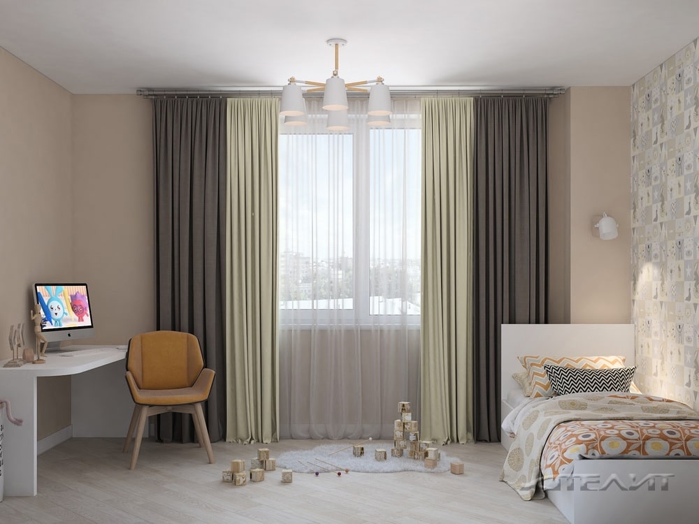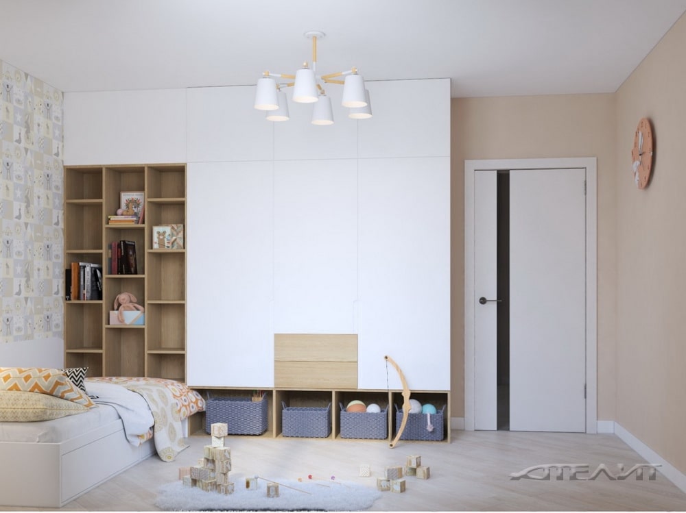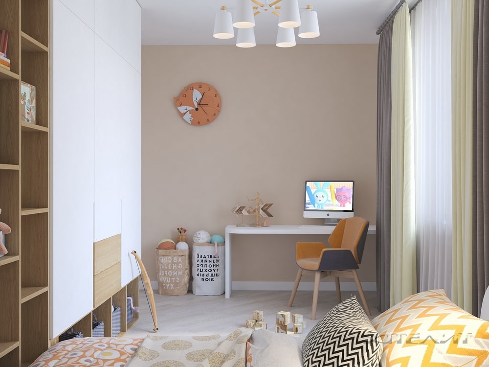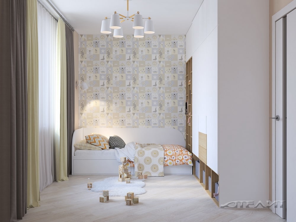 Интерьер оформлен в светлых тонах. Основной тон задает стена с пестрыми обоями. При этом отсутствие резких цветовых контрастов не мешает отдыху. Для хранения вещей предусмотрен вместительный шкаф. Центральная часть комнаты служит игровой зоной, а угол напротив кровати — рабочим пространством.