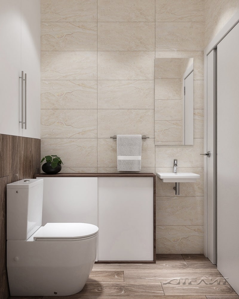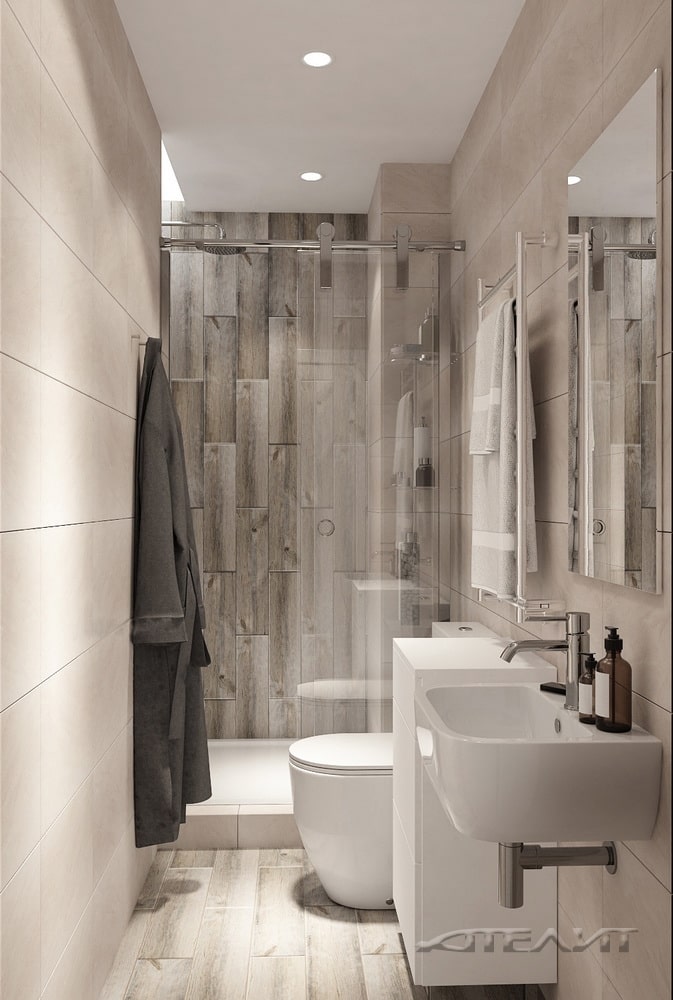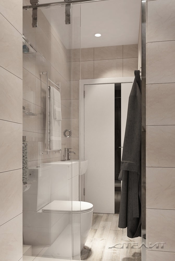 Помещение оформлено в серо-бежевых оттенках. За стеклянной перегородкой размещена душевая кабина. Есть удобная раковина и шкафчик для хранения косметики. Стена в душевой отделана устойчивой к воздействию влаги древесиной.
