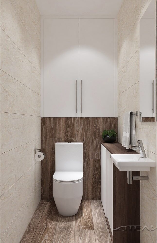 Компактное помещение стало более уютным, благодаря использованию в отделке пола, мебели и стен натурального дерева. Для хранения хозяйственных принадлежностей предусмотрен встроенный шкафчик.