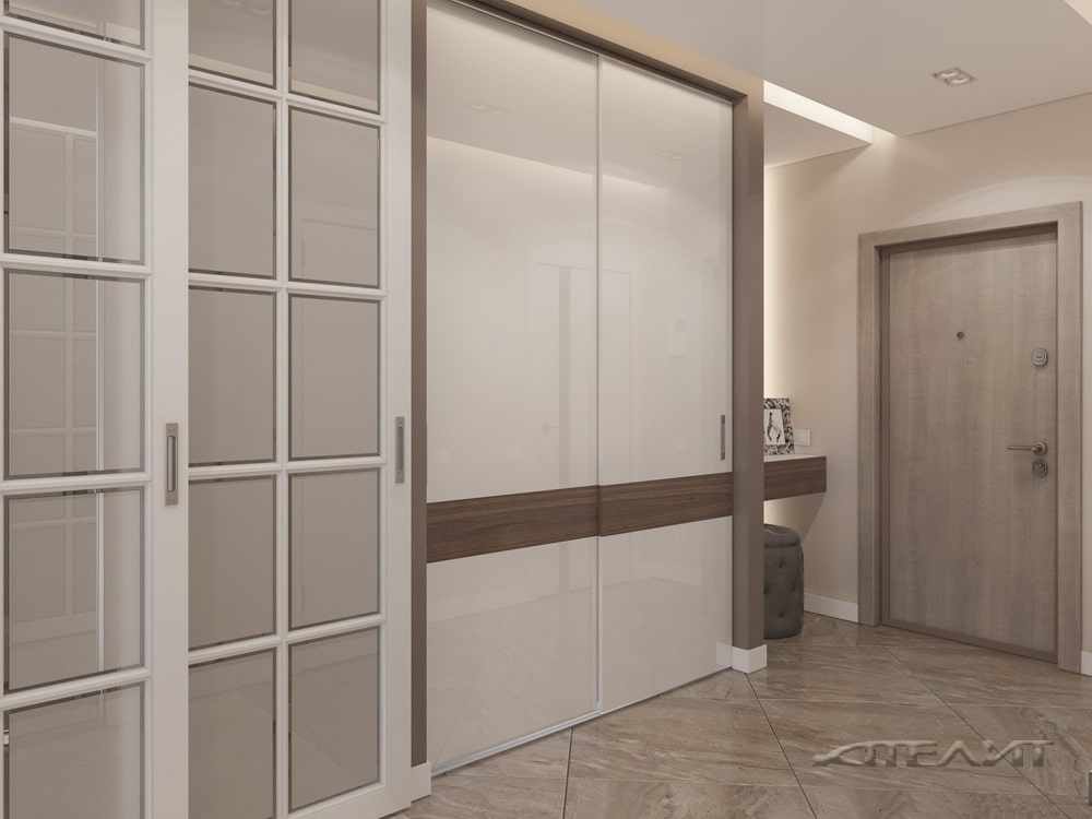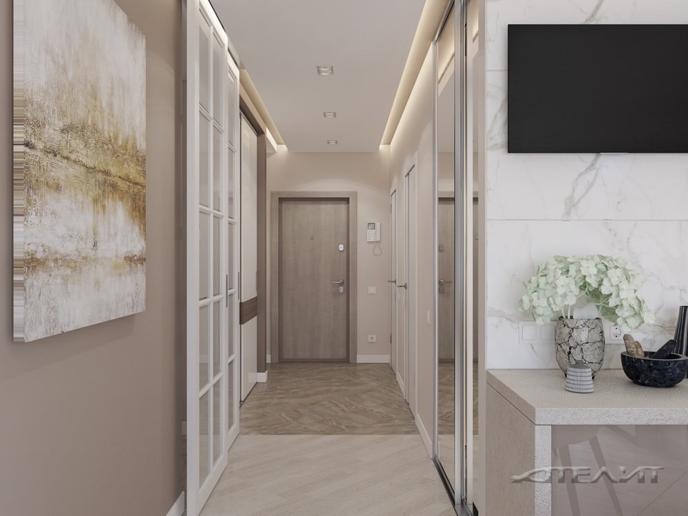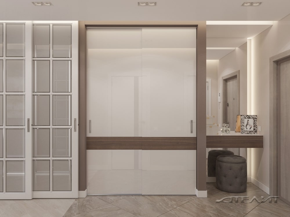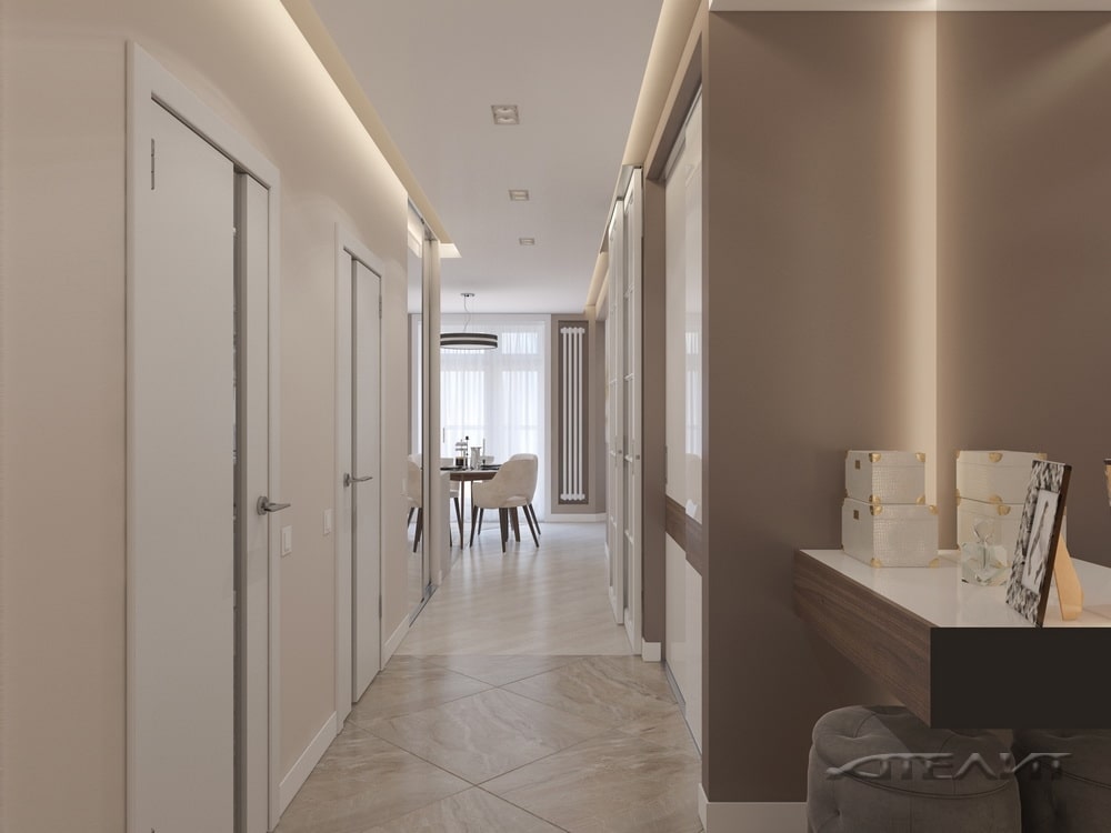 Просторная прихожая зрительно стала еще больше и легче за счет оформления в светлых тонах и мягкого потолочного освещения. Нашлось место для косметического столика с крупным зеркалом и встроенного шкафа-купе для хранения верхней одежды.