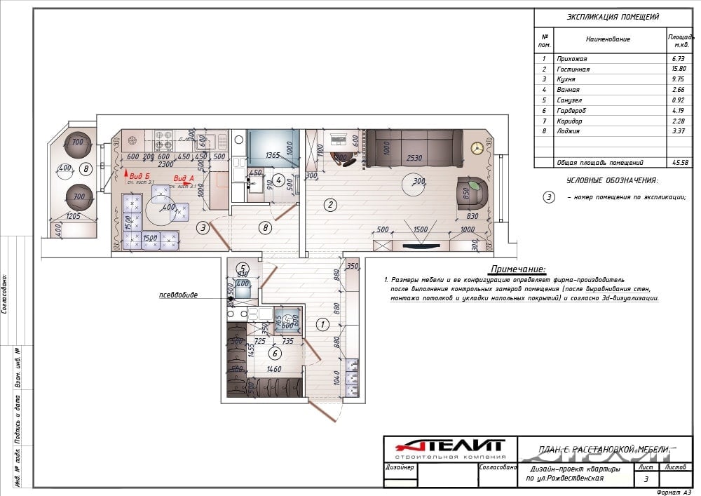 Задача: Обустроить современную удобную квартиру для молодых людей. Сформировать комфортное жилое пространство, совместить гостиную с местом отдыха и кабинетом, разделив функциональные зоны при помощи грамотных интерьерных решений. Разработать интерьер кухни, душевой и туалета. Грамотно распорядиться пространством в прихожей с учетом необходимости обустроить гардероб. Превратить балкон в продолжение жилого пространства.