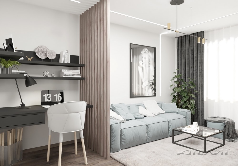 Заполняющим цветом является белый. Он удачно разбавлен темно-серыми и черными элементами. Однако этот контраст не воспринимается резким за счет элементов интерьера переходных оттенков (диван, пуф, ковер), а также благодаря использованию натурального дерева и ламината. Рабочая зона отделена от зоны отдыха декоративной перегородкой. Их граница подчеркнута ковровым покрытием и потолочным освещением. Для хранения вещей предусмотрен вместительный шкаф.