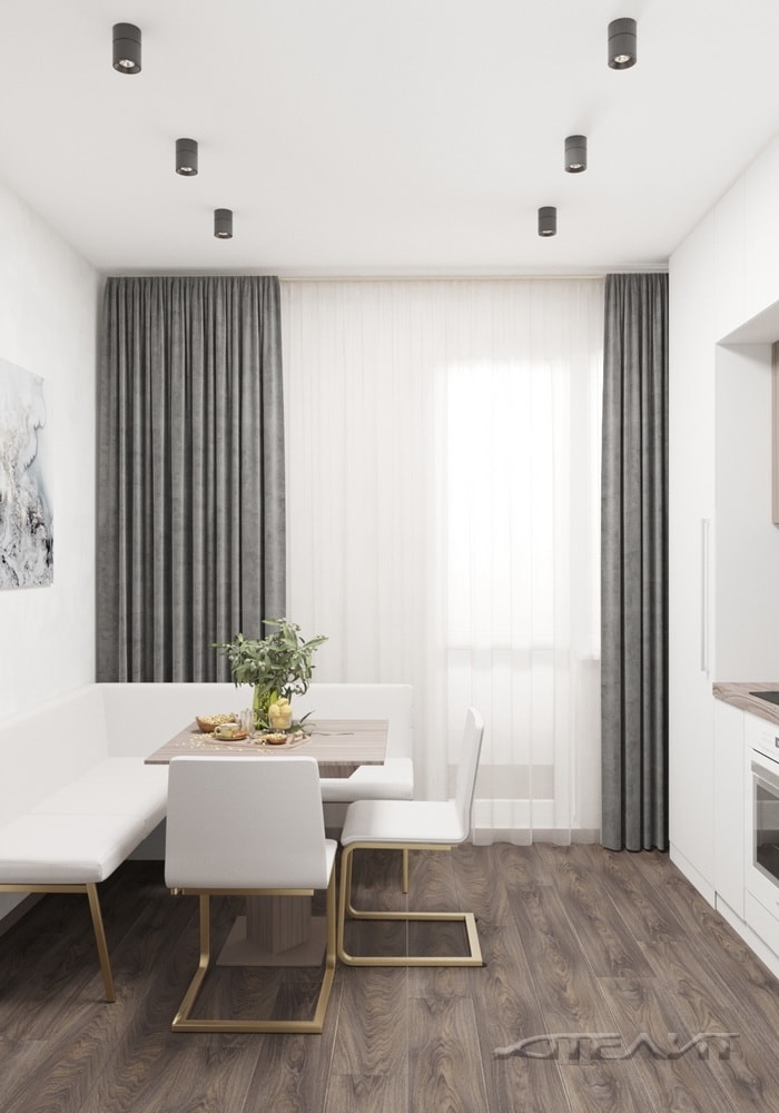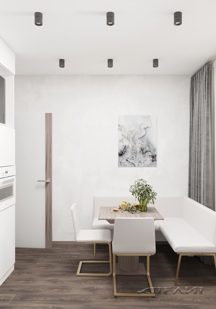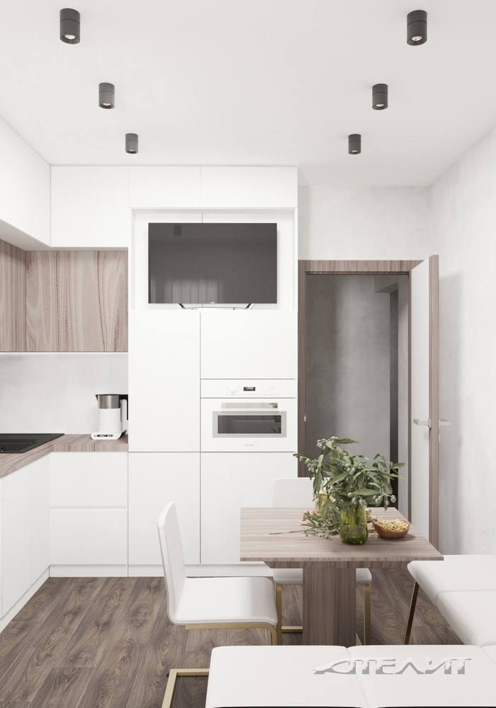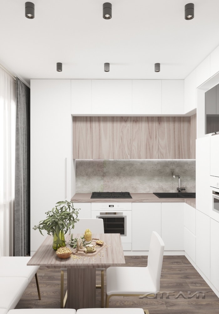 Интерьер выполнен в светлых тонах, разбавленных элементами «под натуральное дерево» (ламинат, скинали, обеденный стол, оформление дверной коробки). Благодаря этому помещение выглядит более теплым и уютным, несмотря на обилие белого заполняющего цвета и минималистичного оформления. На ограниченной площади удалось компактно разместить все необходимое для приготовления и совместного приема пищи.