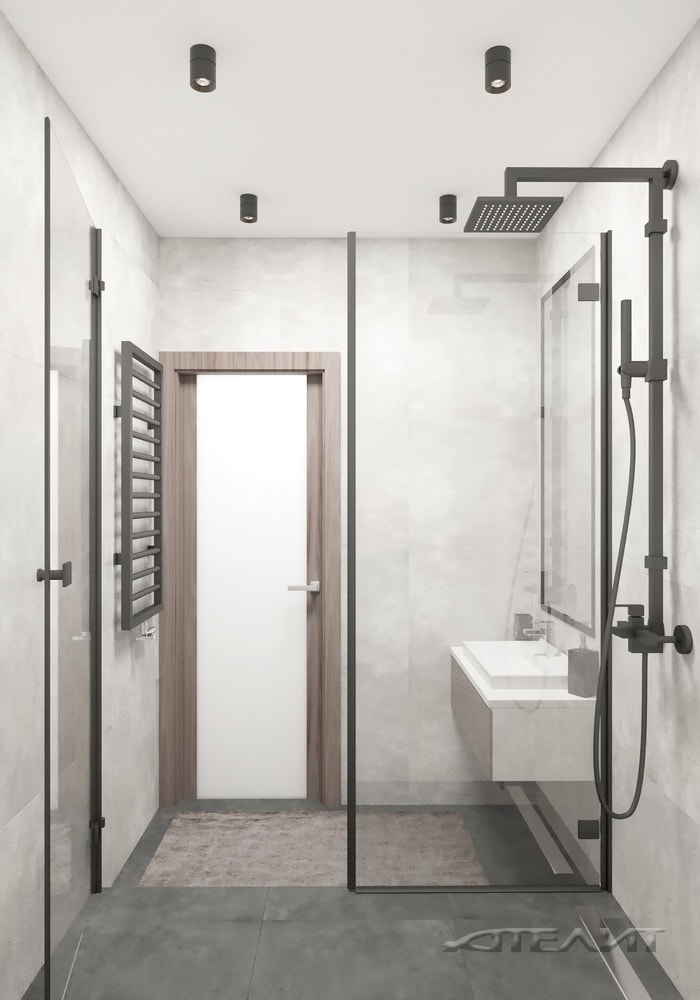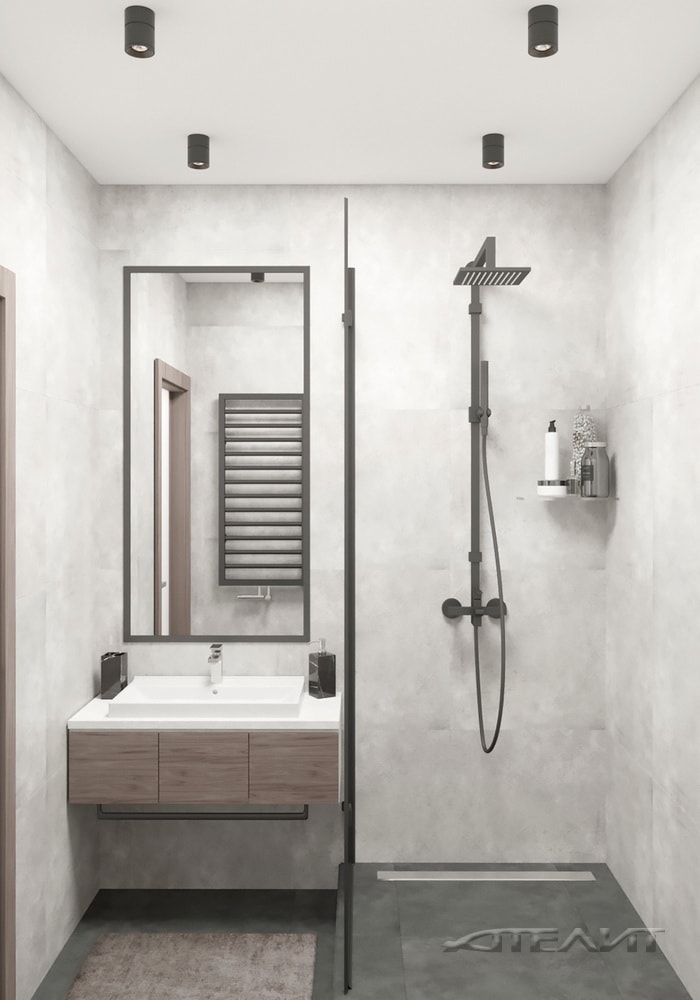Минималистично, стильно и функционально — именно так можно охарактеризовать выбранное решение. Цветовая гамма в целом перекликается с оформлением жилых комнат, но при этом выглядит самобытно. Во многом благодаря использованию угловатых элементов и чуть более темным цветовым решениям. Несмотря на ограниченное пространство, здесь удалось разместить все необходимое: просторную душевую кабину, большое зеркало, раковину и полки для косметики. Акцентными элементами служат крупное зеркало, полотенцесушитель и плафоны светильников.