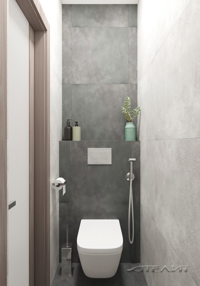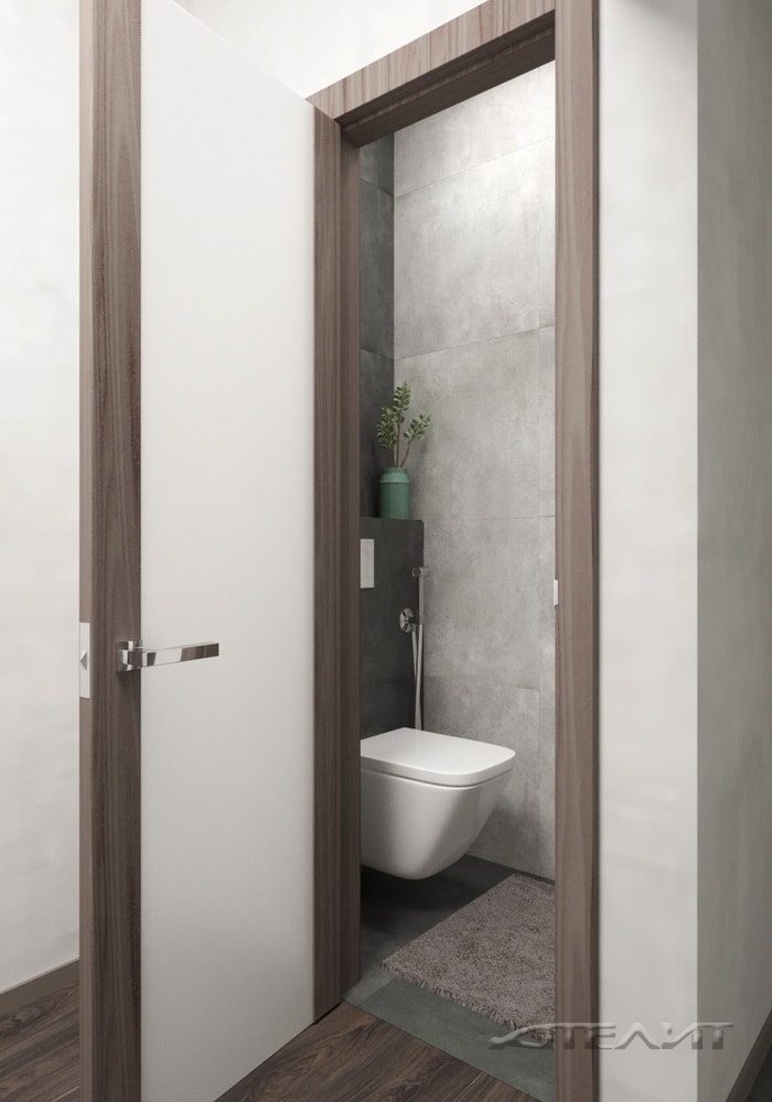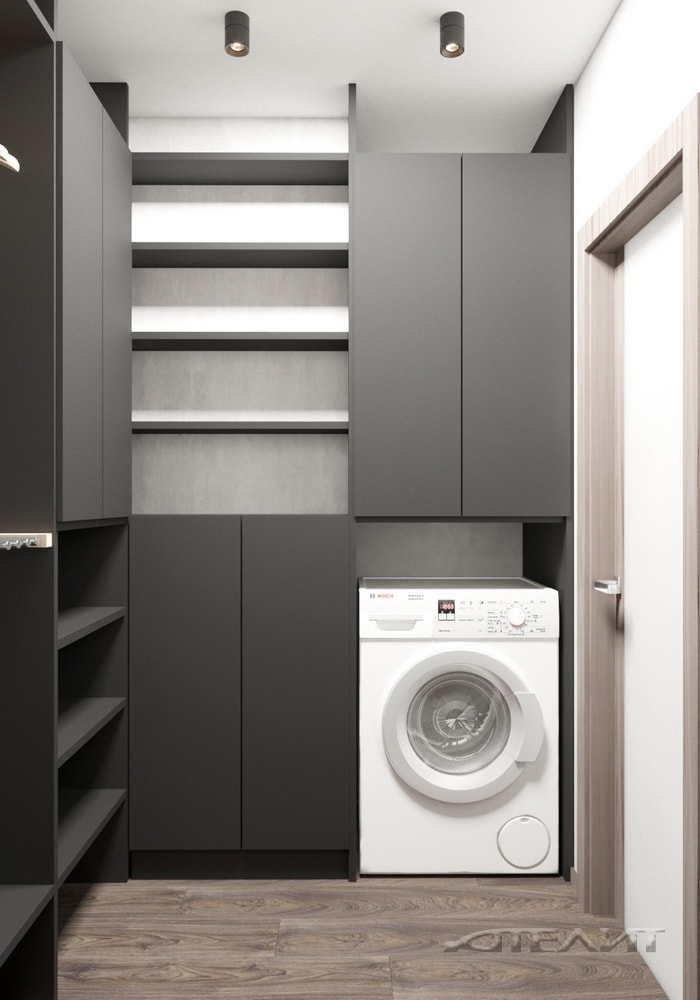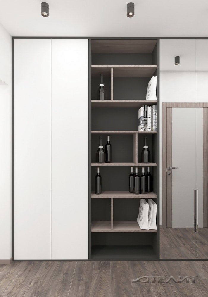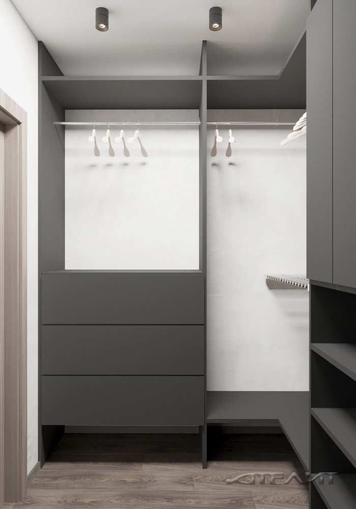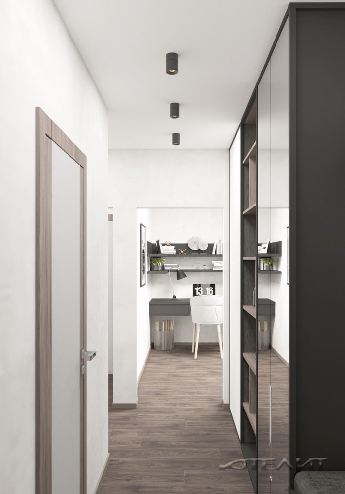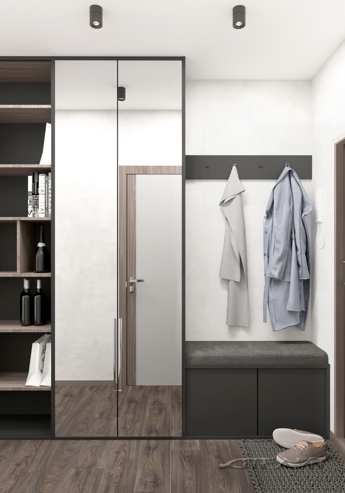 Цветовое оформление прихожей одновременно перекликается и с жилой зоной, и с оформлением санузла (обилие белого, темно-серые акценты). Для хранения верхней одежды предусмотрен шкаф.