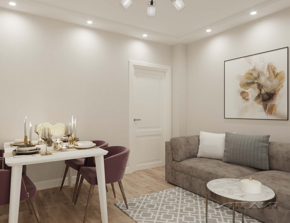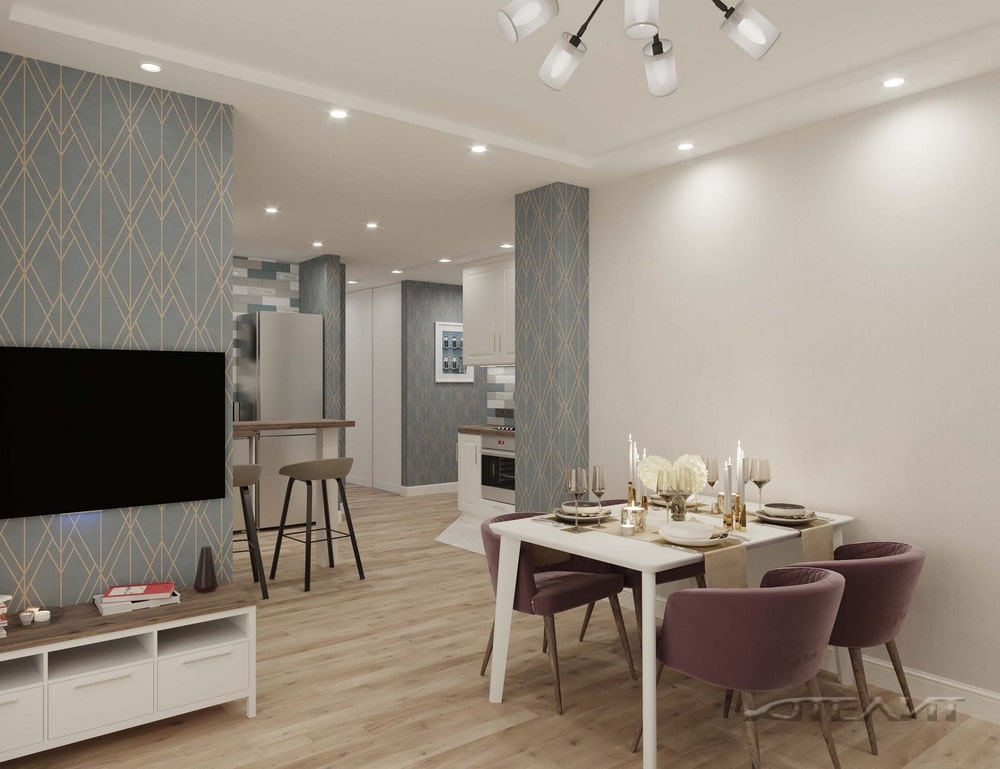 Для оптимизации пространства гостиная объединена со столовой. Но при этом обеденный гарнитур расположен так, чтобы не занимать комнату, когда им не пользуются. Кухня отделена от гостиной барной стойкой. Зона готовки обозначена белым напольным покрытием и дополнительным освещением. Обе части комнаты связаны бирюзово-пастельным оттенком стен, который хорошо сочетается с натуральным деревом и ламинатом.