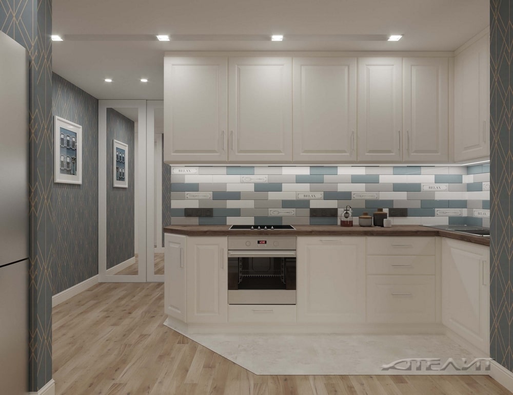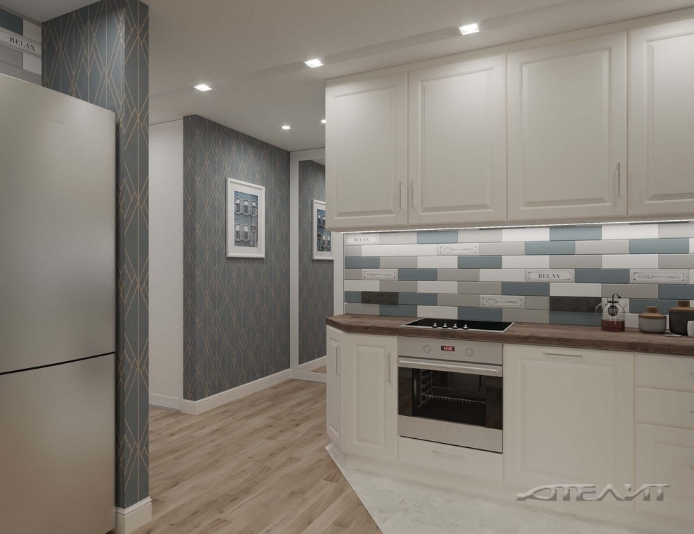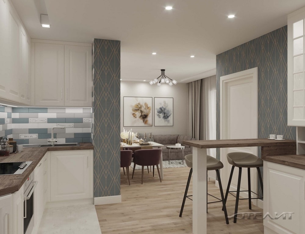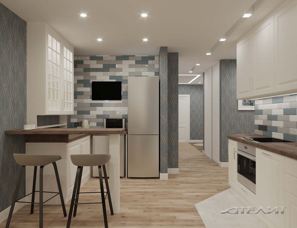 Интерьер выполнен в современном стиле, который построен на стыке минимализма и лофта (имитация кладки, натуральное дерево). Выбрана спокойная цветовая гамма, которая не выглядит скучной за счет использования оригинальных материалов отделки. Грамотное зонирование позволило отделить зону готовки от остальной части кухни, а саму кухню — от гостиной. При этом интерьер выглядит гармонично и не перегружен лишними деталями. Заказчик остался доволен реализацией проекта.