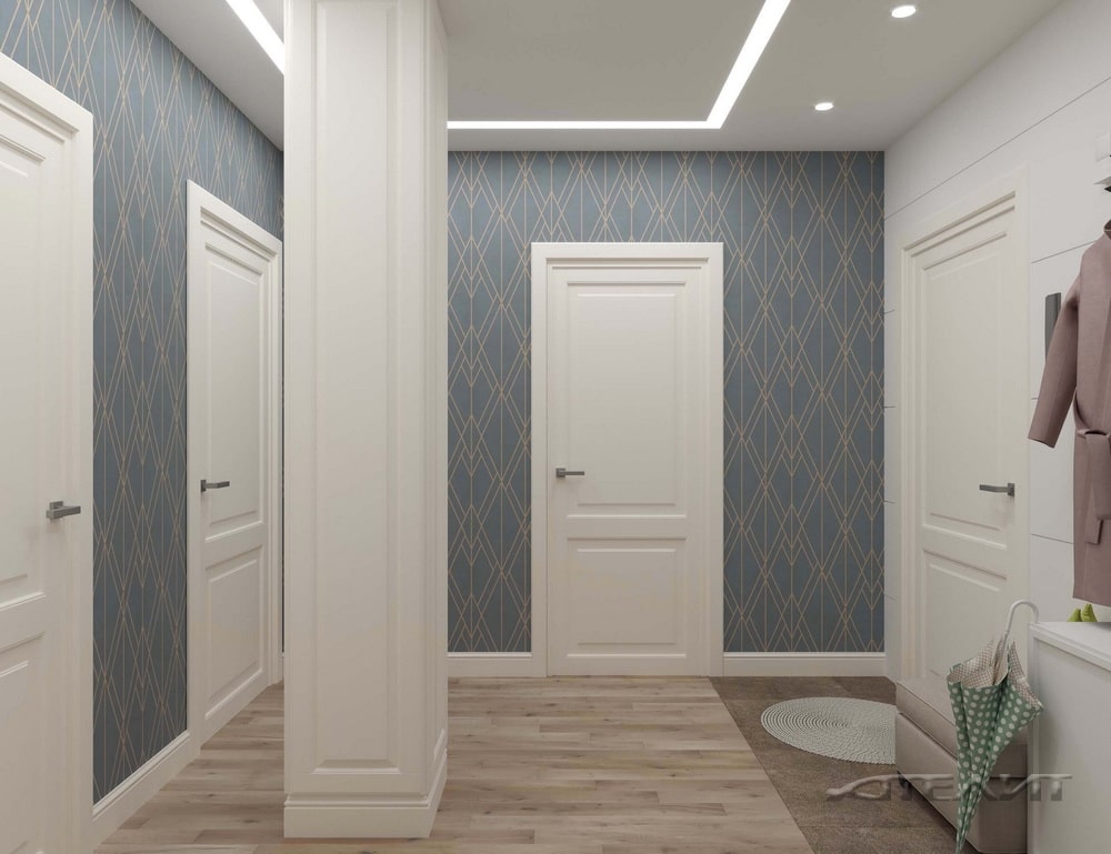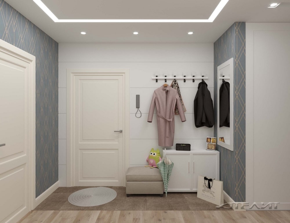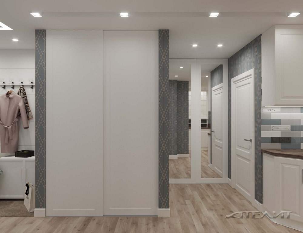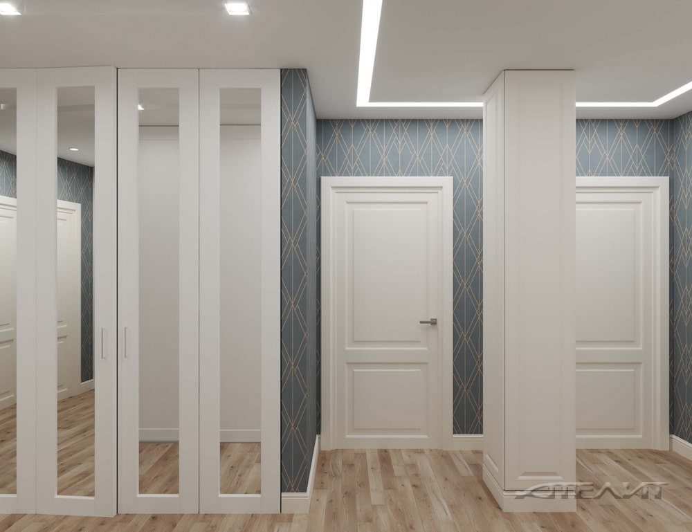 Характерная особенность планировки — небольшая прихожая, из которой можно попасть сразу в четыре комнаты. В оформлении использованы те же бирюзово-пастельные обои с красивым узором, что и в гостиной. При этом потолочное освещение и зеркальные фасады шкафов для мебели зрительно делают помещение больше и светлее. В комнате нашлось место для пуфа, зеркала, комода, вешалки и вместительного шкафа-купе для верхней одежды.