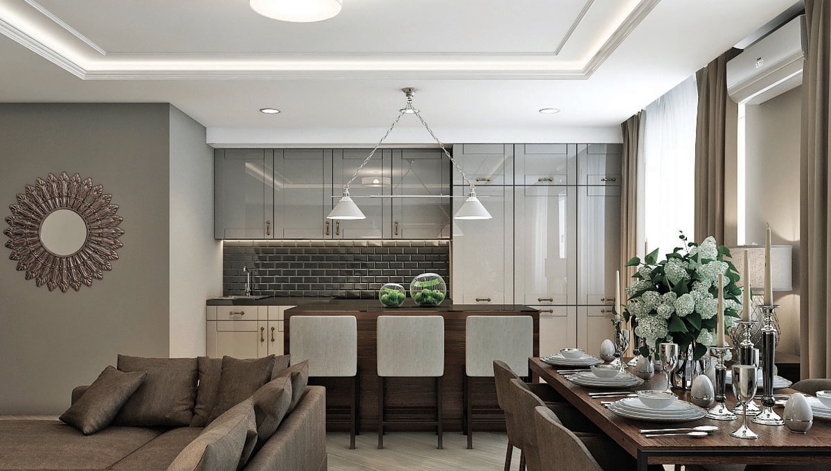 Дизайнеры объединили гостиную, кухню и столовую. Помещение оформлено в едином стиле, здесь специалисты отказались от зонирования даже с помощью мелких дизайнерских элементов, напольных и потолочных покрытий. Обратите внимание на оформление стены за телевизором и зону между верхними и нижними кухонными ящиками.
