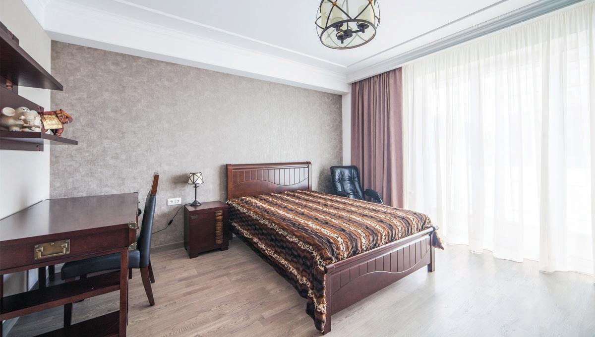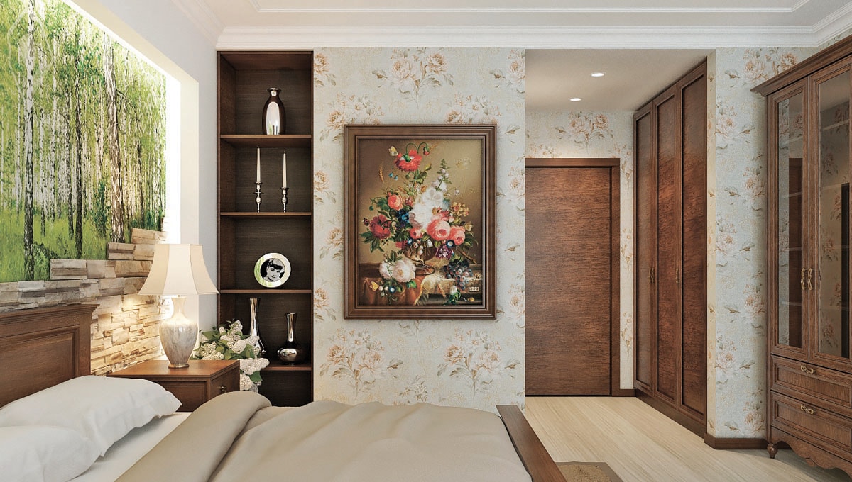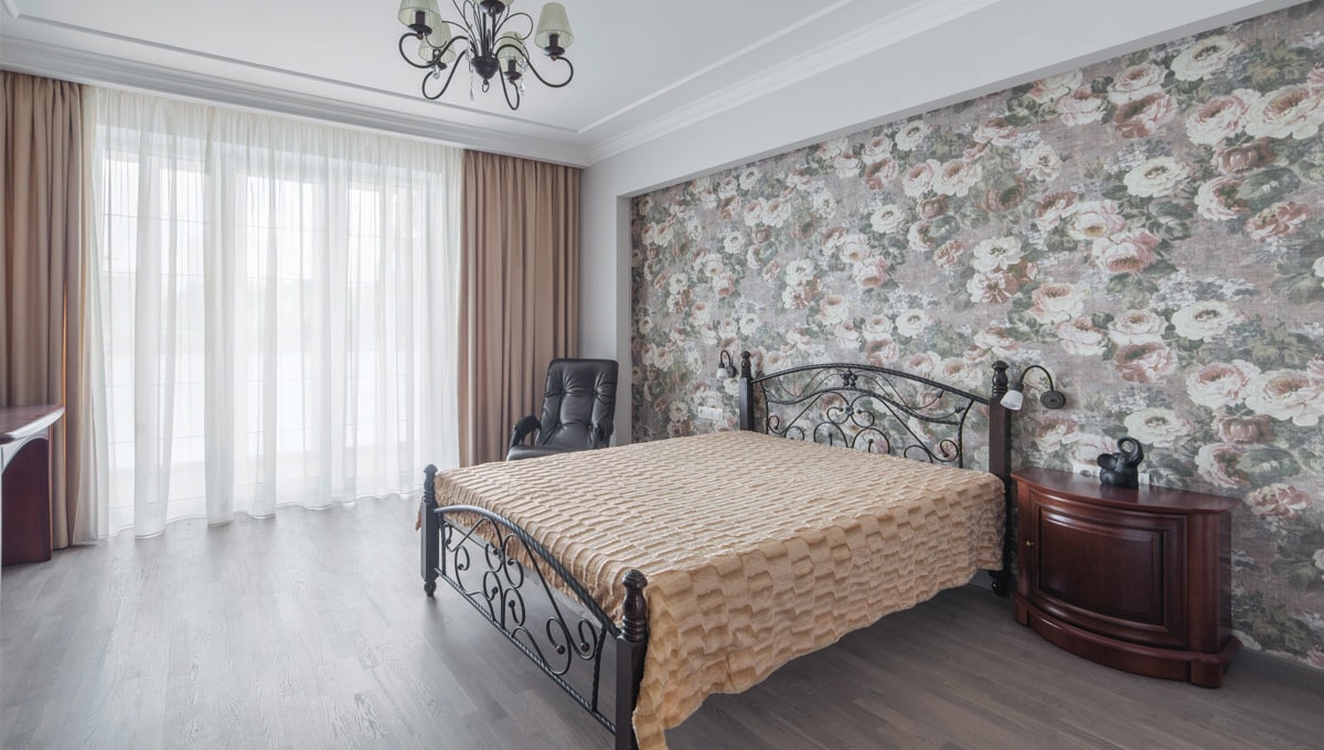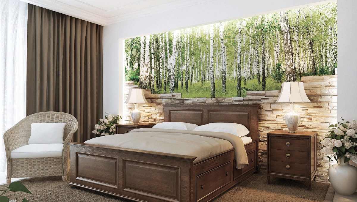 В спальне дизайнеры предпочли природные мотивы. Яркие фотообои на стене за кроватью и мебель с имитацией мореного дуба создали в комнате атмосферу тепла и комфорта.