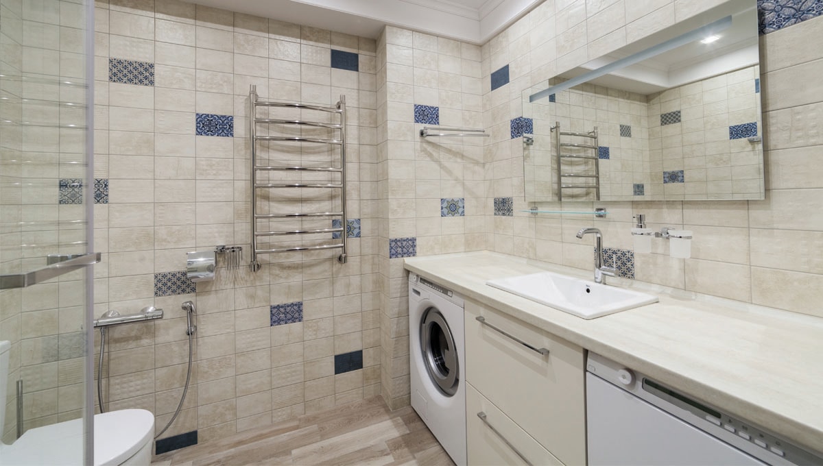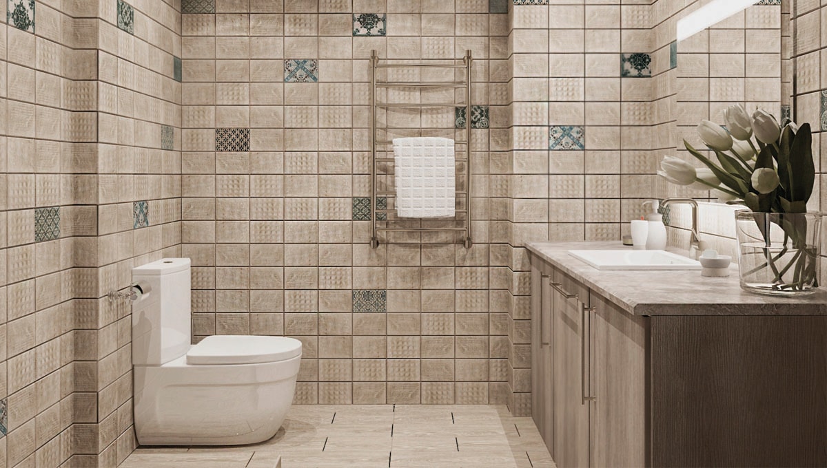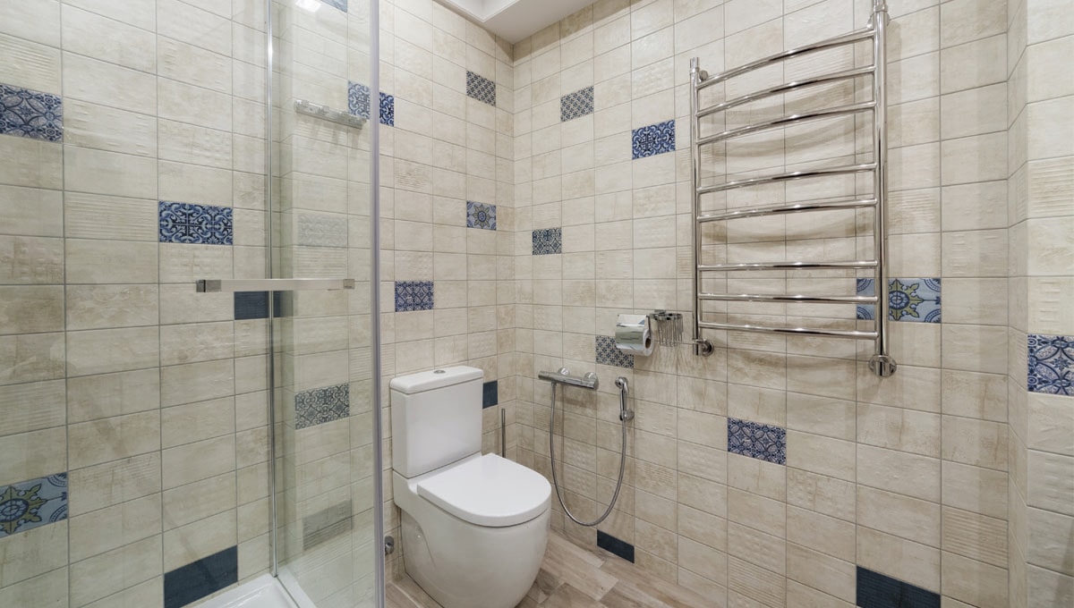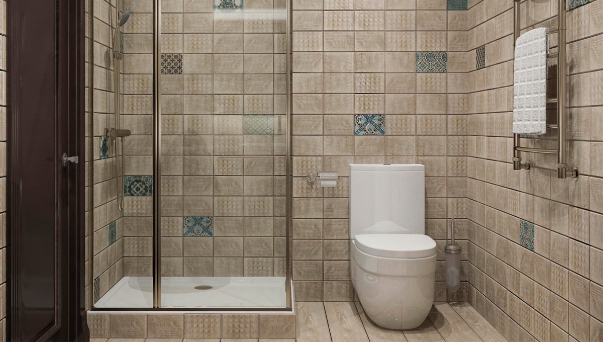 В санузле было решено установить стеклянную душевую кабину. Ее чуть приподняли, чтобы на полу не скапливалась и не застаивалась вода. В качестве отделочного материала использована плитка небольшого формата.