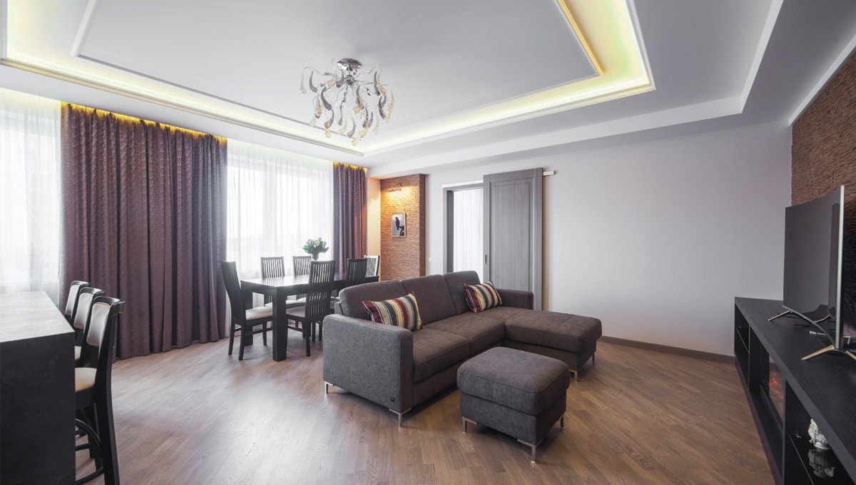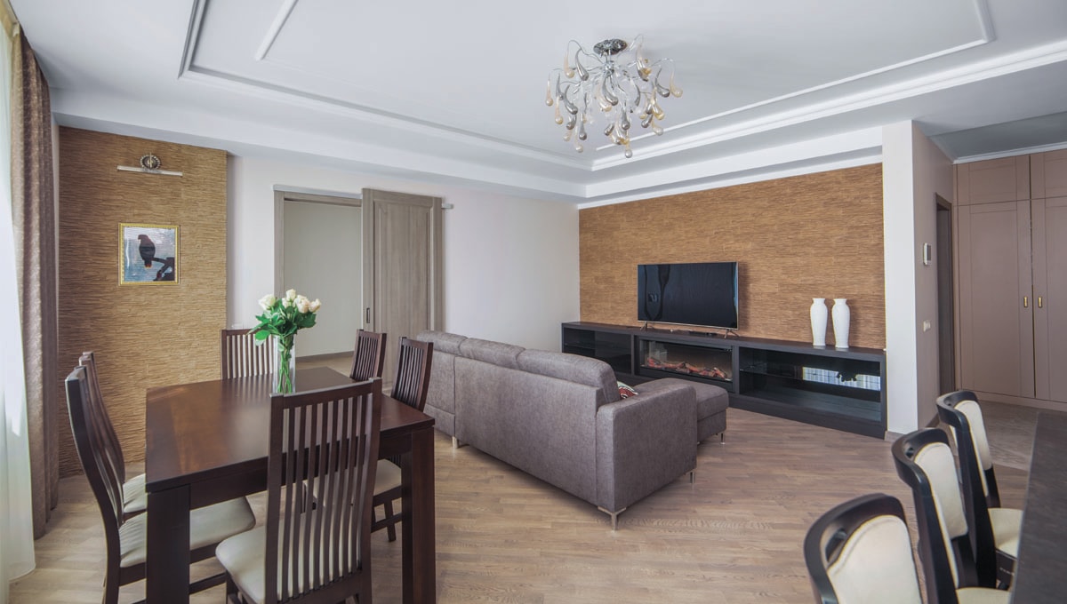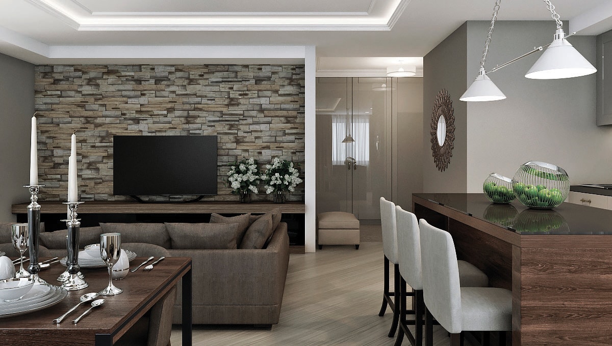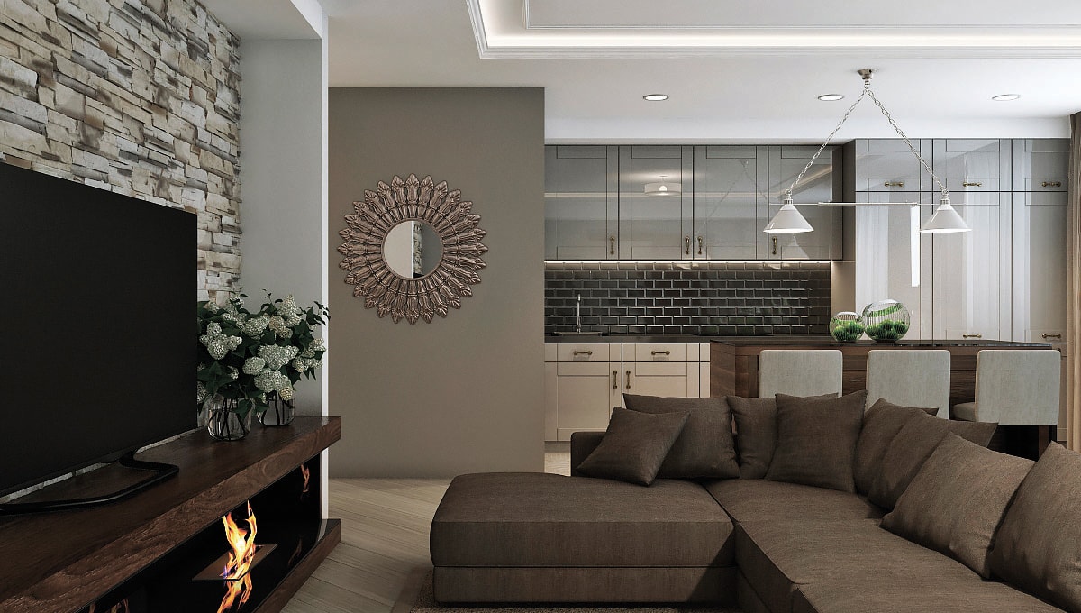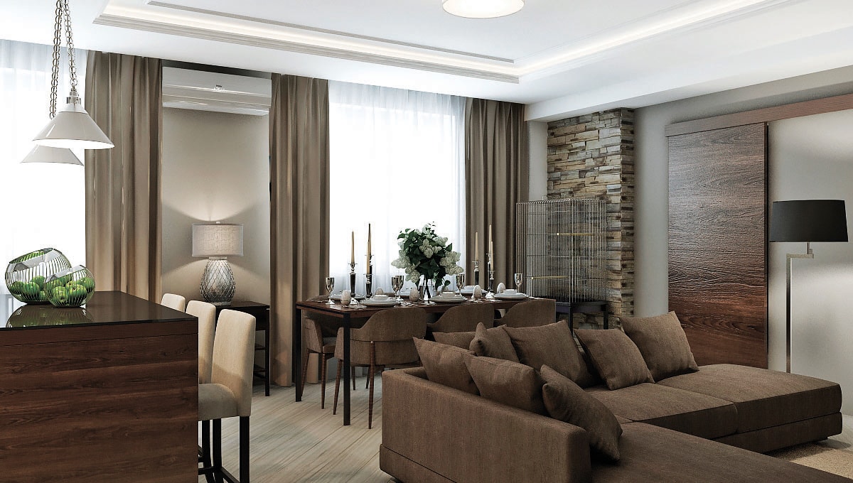 Просторная квартира для семейной пары от компании «Ателит». Интерьер выдержан в эклектичном стиле, преобладают кофейные тона. Этот цвет имеет большой потенциал как с дизайнерской, так и с психологической точки зрения. Он символизирует надежность, преданность, стабильность. Он также оказывает положительное воздействие на человека, например, во время стрессовых ситуаций способен усиливать успокаивающий эффект, а во время болезни даже облегчает физическую боль. Кстати, коричневый – это цвет земли, который к тому же символизирует безопасность и семейный очаг.