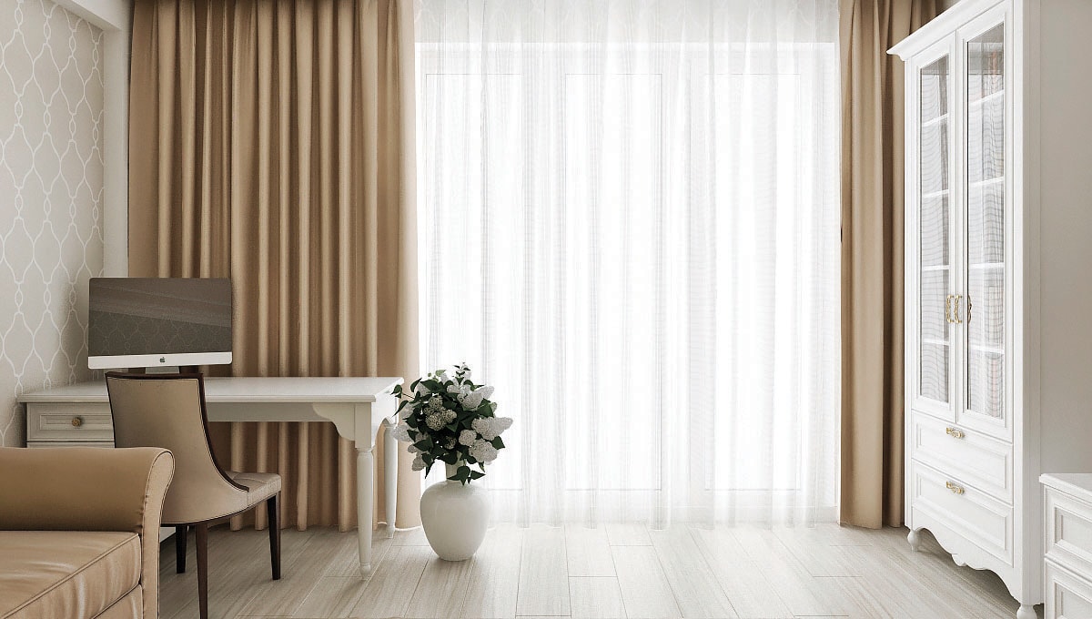 Благодаря удачному сочетанию светлых оттенков интерьер кабинета получился нежным. Работать в таком помещении одно удовольствие.