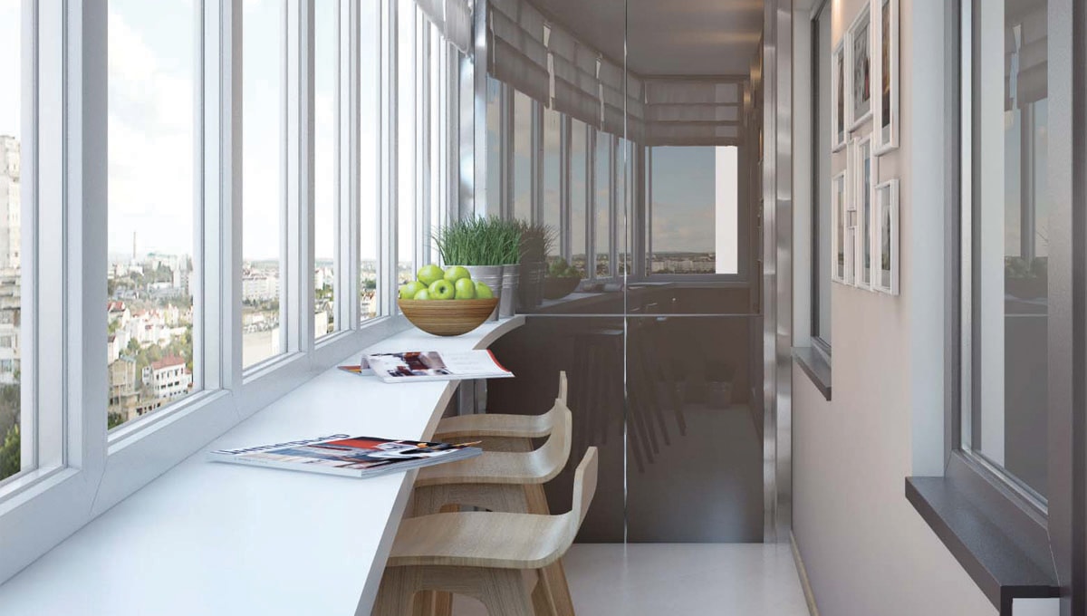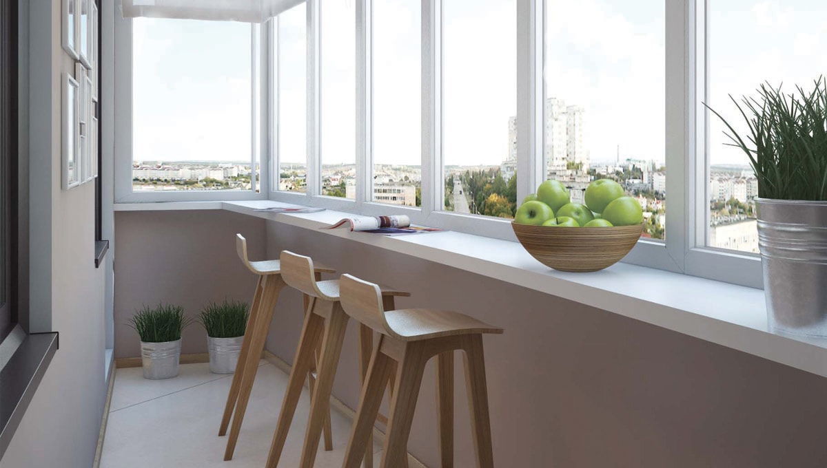 Просторный балкон с видом на город стал еще одной прекрасной зоной для отдыха. Поскольку вход на него с кухни, в хорошую погоду здесь можно завтракать или обедать и любоваться красотой городского пейзажа, благо дизайнеры предусмотрели широкий подоконник.