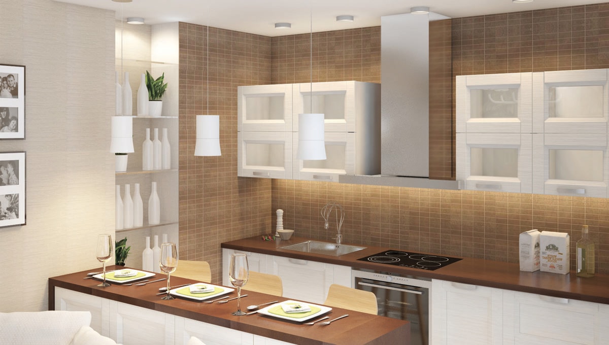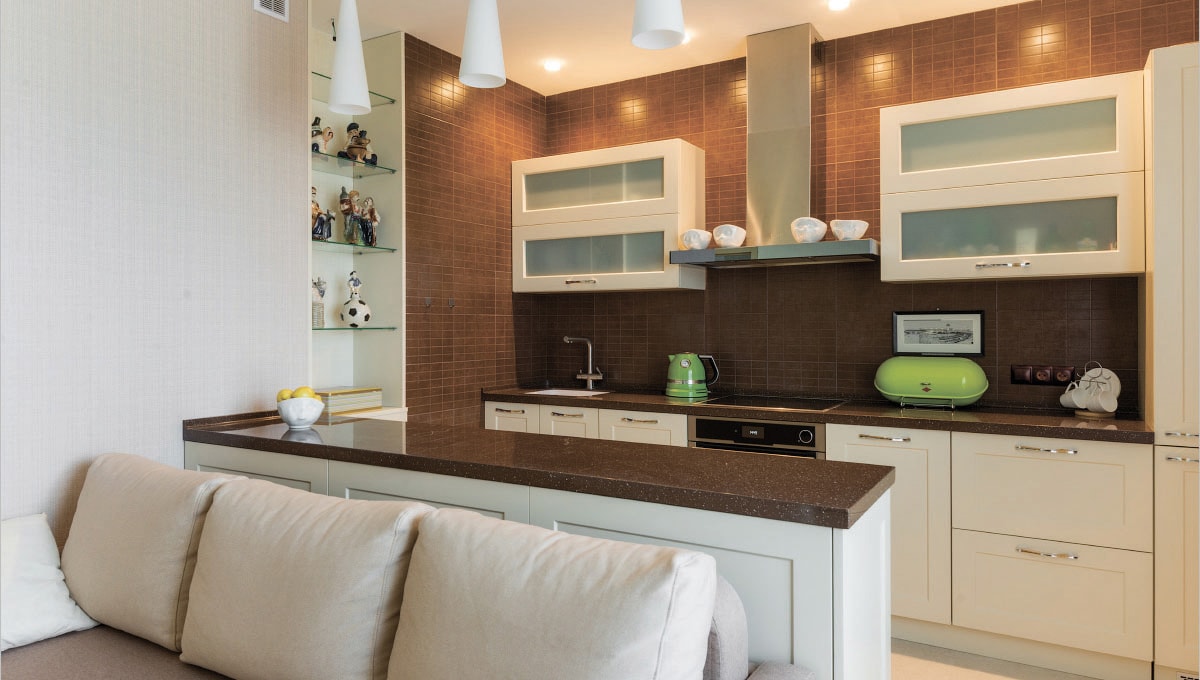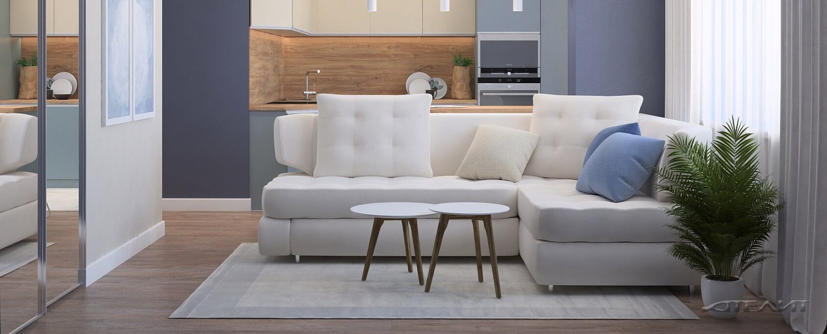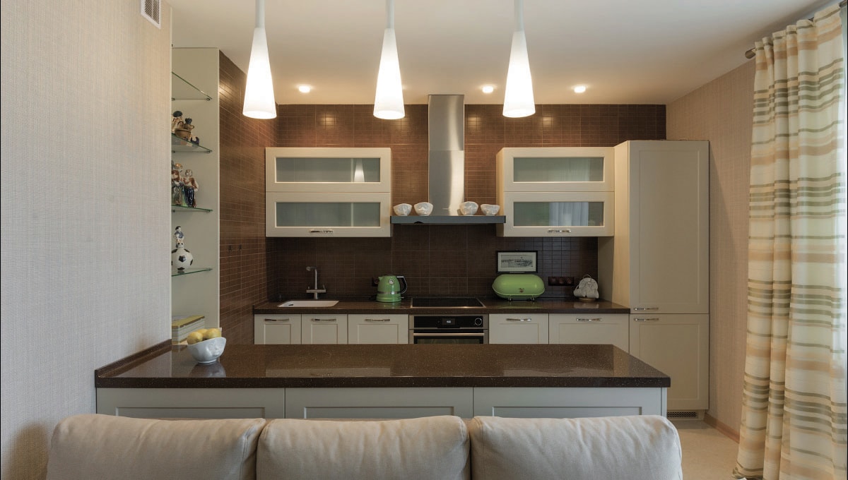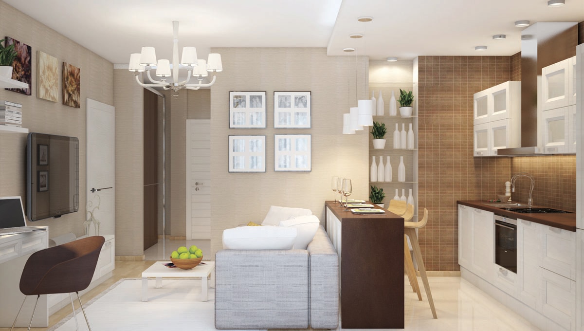 Для гостиной и кухни выбраны белый, бежевый, серий и коричневый цвета. Это классическое сочетание, неброское и не блеклое, благодаря ему в комнате появляется ощущение теплоты и комфорта. Зона гостиной и кухни разделены с помощью стойки, за которой принято завтракать, обедать и ужинать.