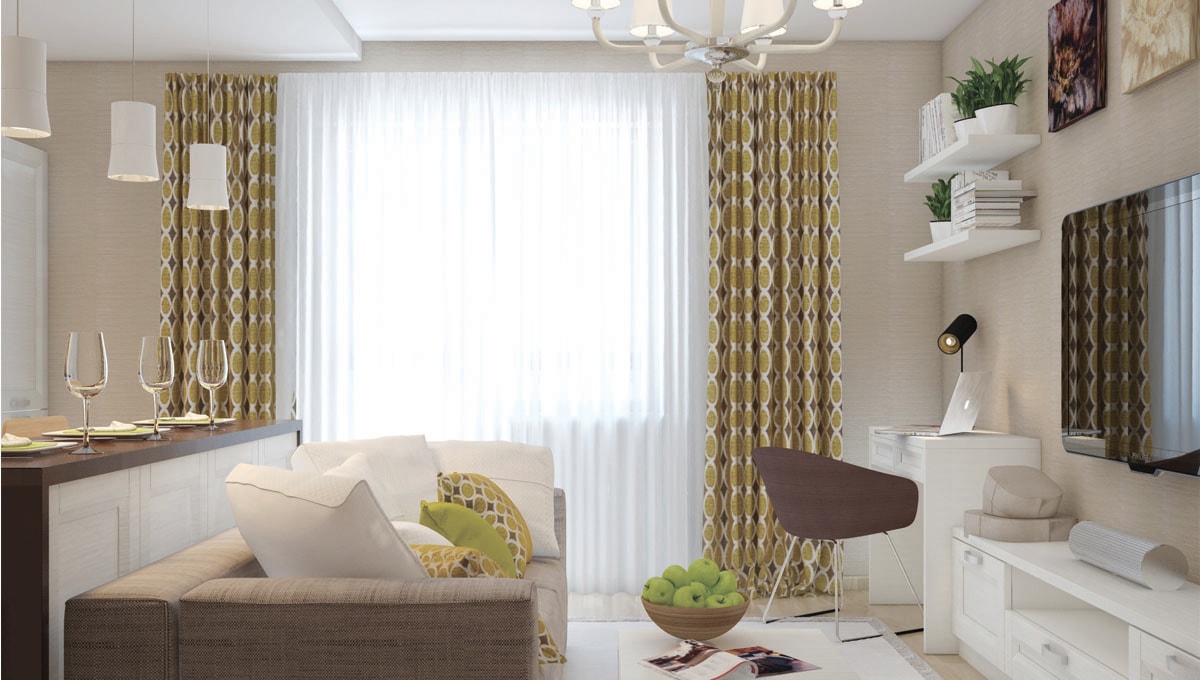 Для гостиной и кухни выбраны белый, бежевый, серий и коричневый цвета. Это классическое сочетание, неброское и неблеклое, благодаря ему в комнате появляется ощущение теплоты и комфорта. Зона гостиной и кухни разделены с помощью стойки, за которой принято завтракать, обедать и ужинать.