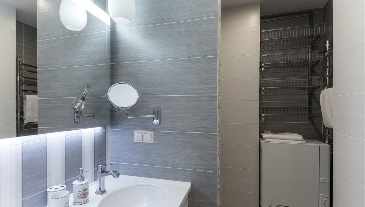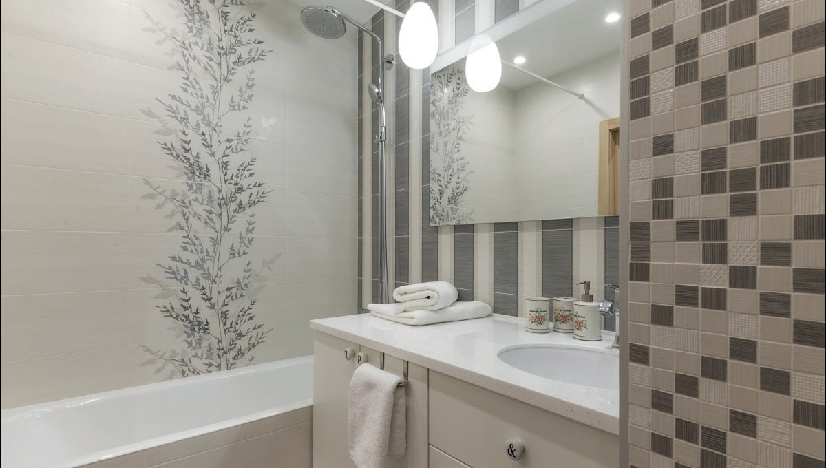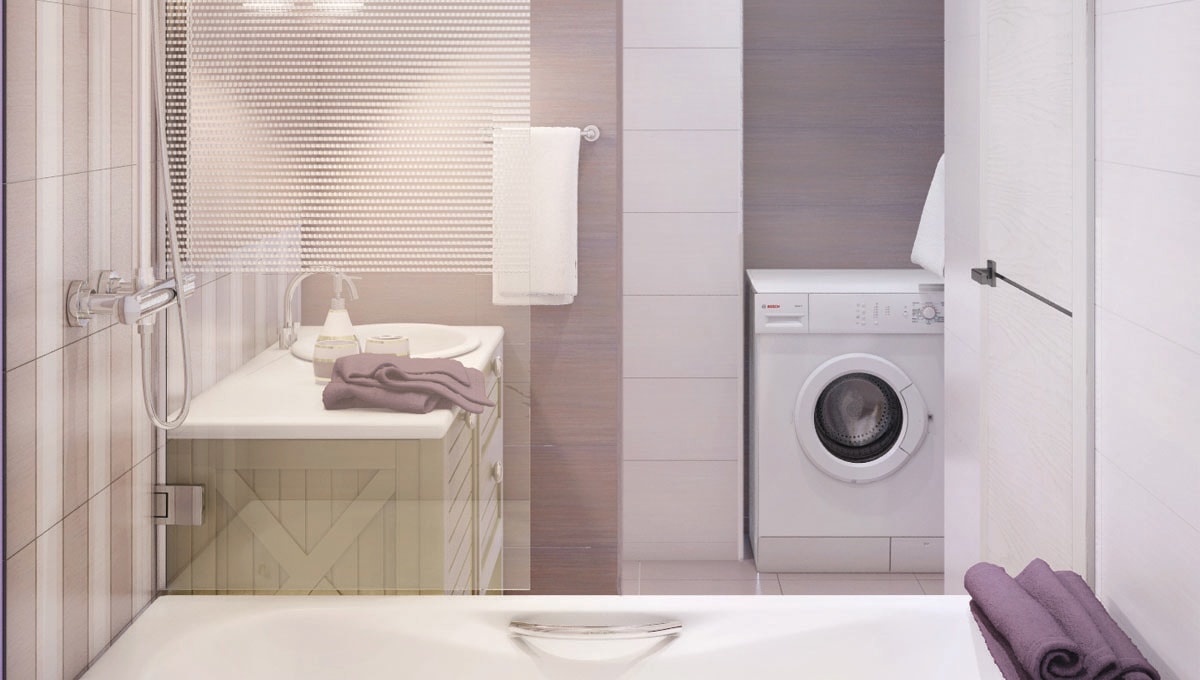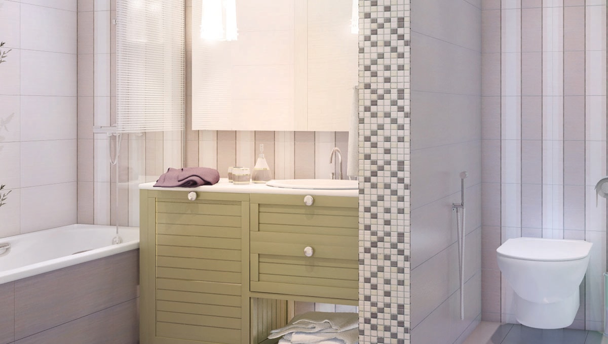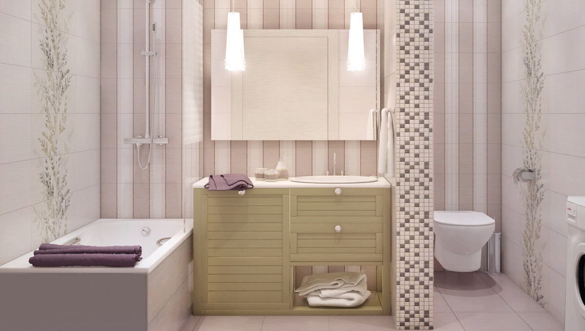 В санузле тоже мягкие оттенки, только вместо бежевого и коричневого здесь использован сиреневый цвет. Обратите внимание на декор и вертикальную полоску, такое решение идеально подойдет для помещений с низкими потолками.