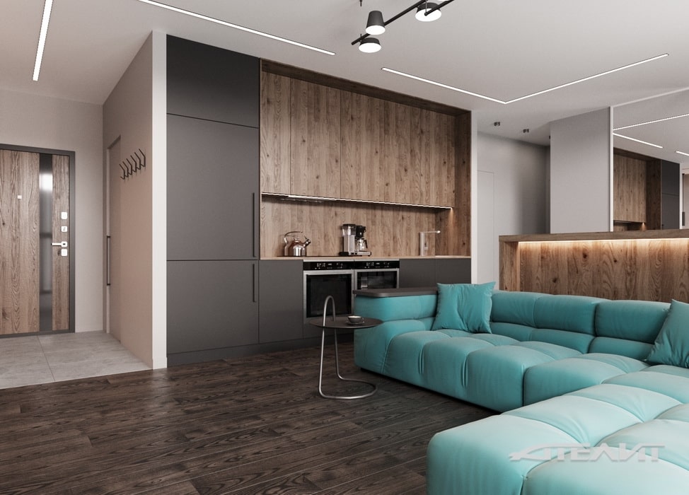 Эта квартира действительно отвечает всем актуальным тенденциям и трендам. Его главные черты: практичность, функциональность, нейтральная цветовая гамма в гостиной, но с ячркими акцентами. Эргономичность планировки, расстановка мебели и лаконичные формы;