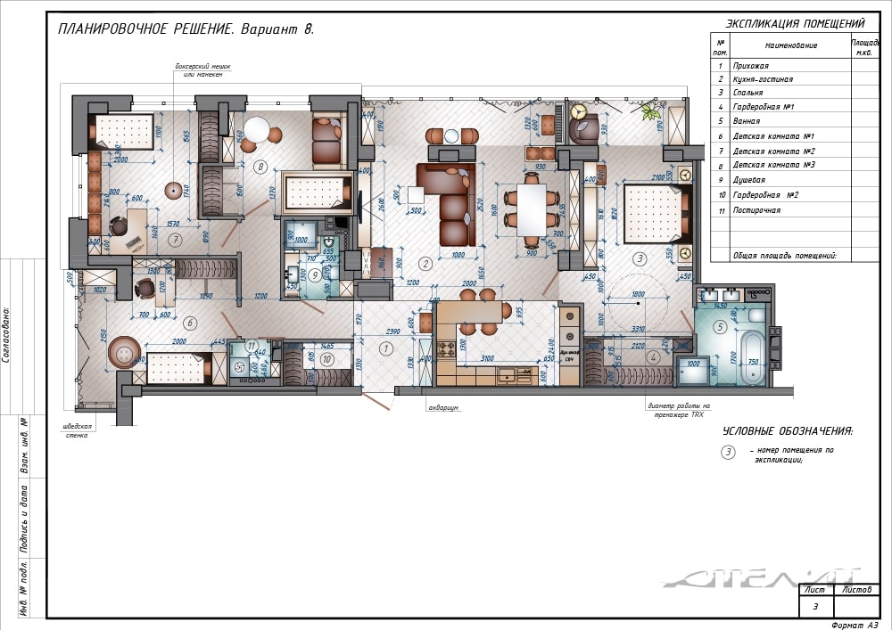 Задача: Благоустроить квартиру для семьи с тремя детьми. За основу взять современный интерьер и спокойные тона. Оборудовать три детские комнаты для малышей разного возраста. Обустроить две ванные комнаты: для взрослых и детей