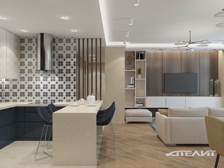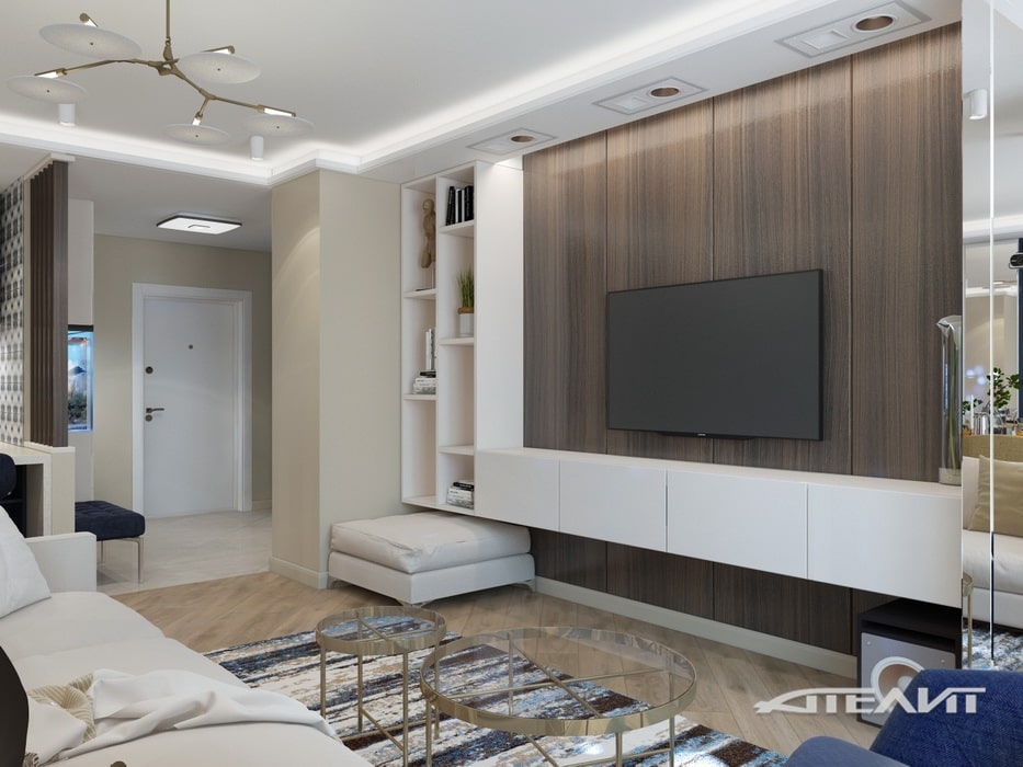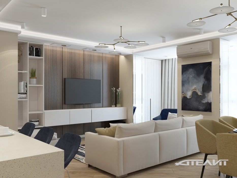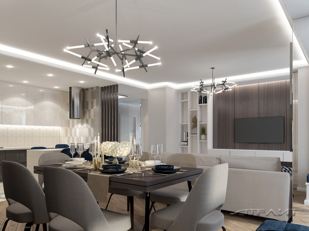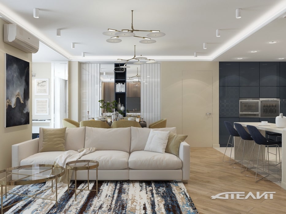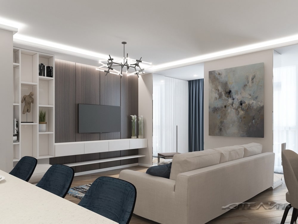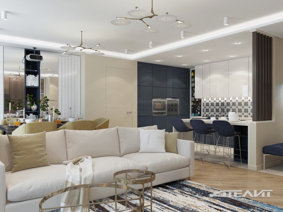Гостиная оформлена в светлых тонах. Чтобы оживить интерьер, дизайнеры решили добавить синий акцент. Благодаря скрытой потолочной подсветке и оригинальной люстре, бело-синее сочетание создает приятную атмосферу, в комнате царят уют и комфорт.
