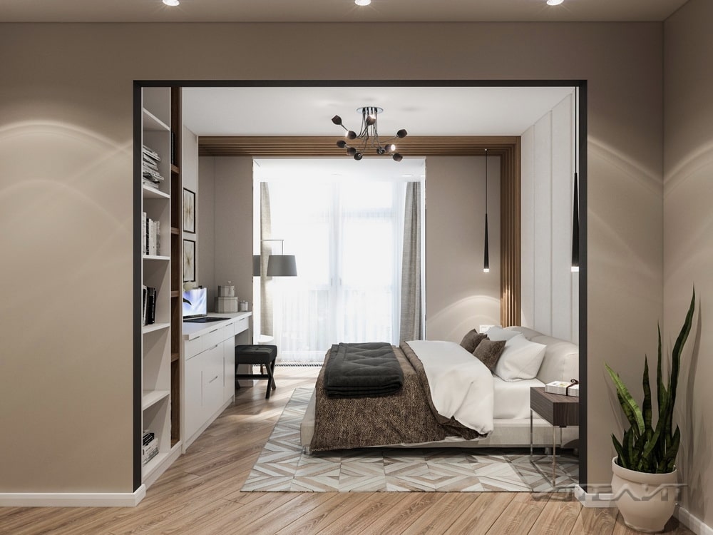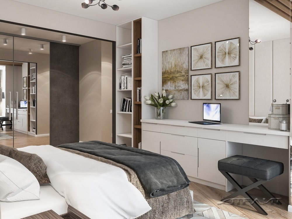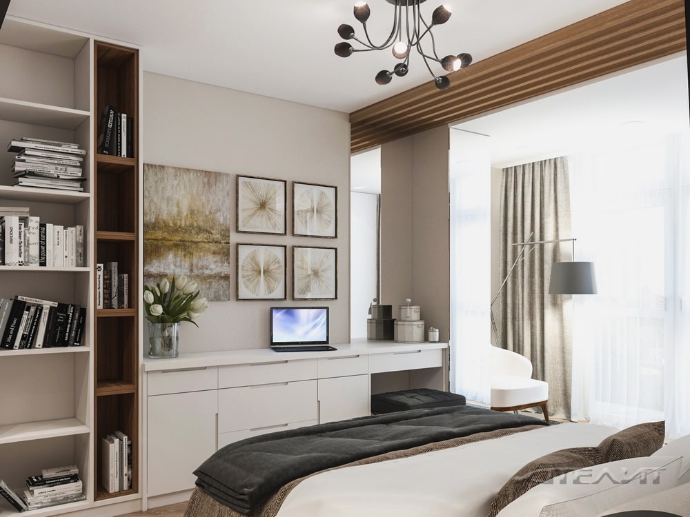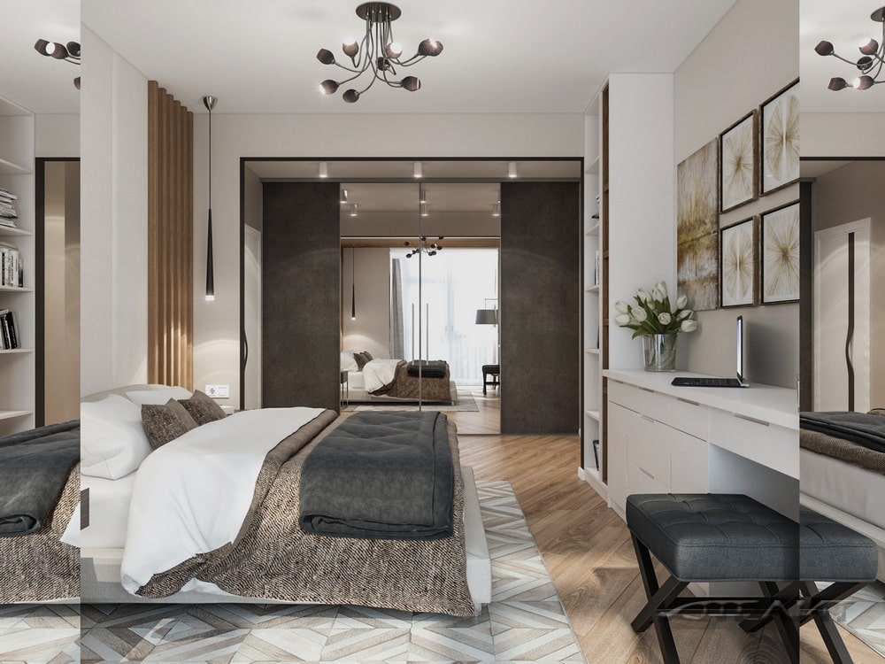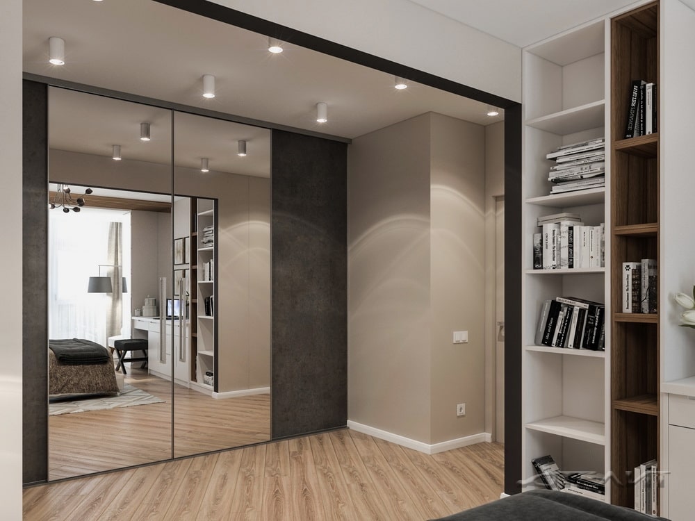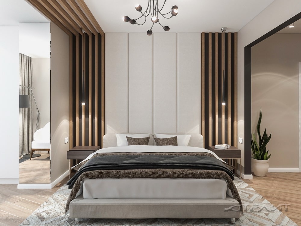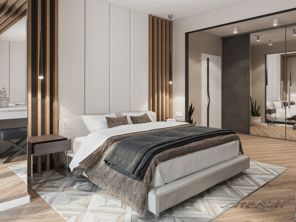 Спальня достаточно просторная, но не только потому, что велика ее площадь, такому восприятию во многом способствуют зеркала и светлый фасад мебели. Интересно смотрятся декоративные деревянные панели.