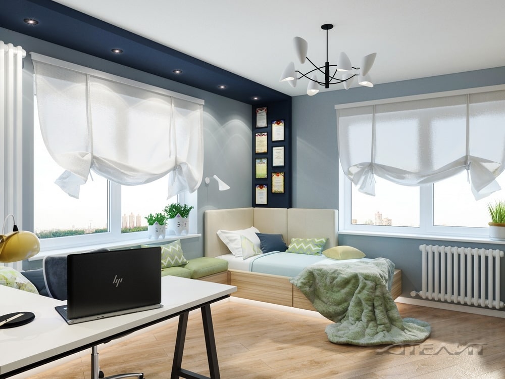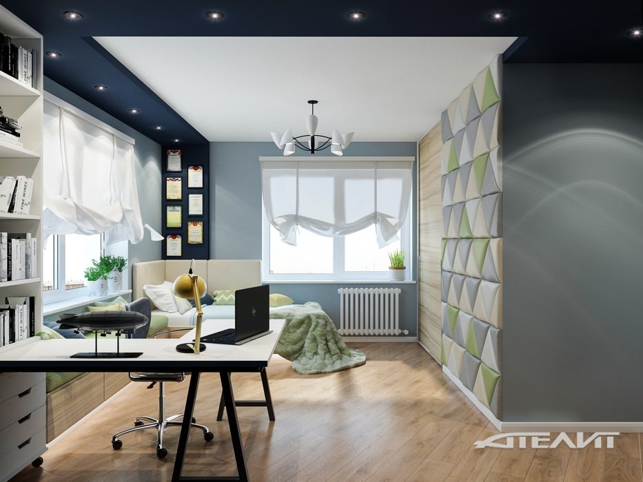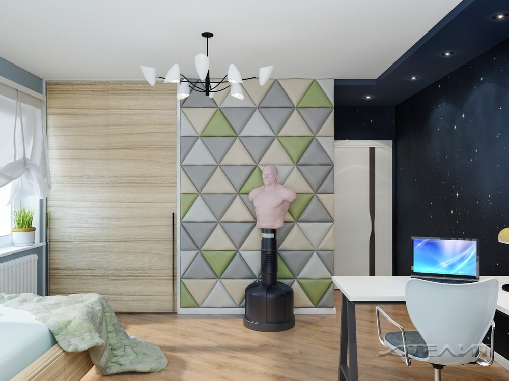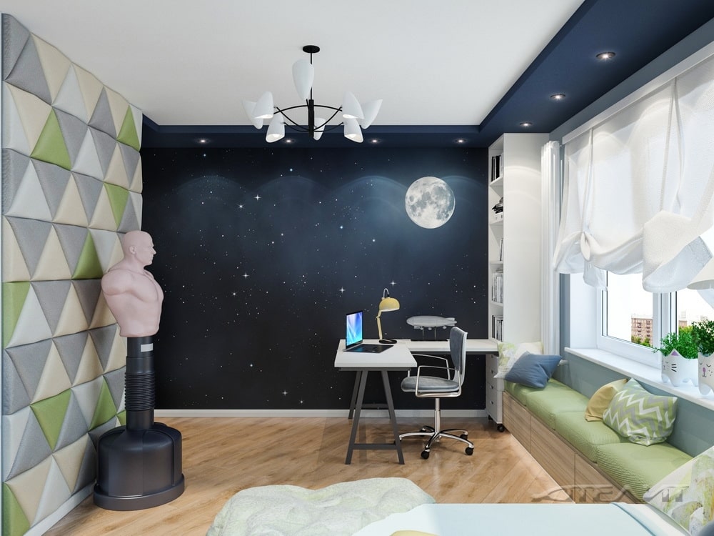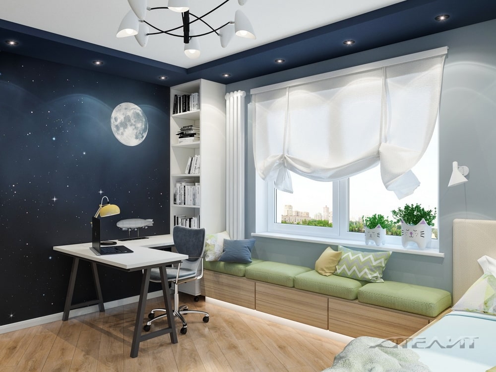 Интерьер детской комнаты напоминает планетарий. Дизайнеры решили отказаться от традиционного приема, когда используют натяжной потолок «звездное небо». Акцент решено сделать на стене, именно она стала имитацией ночного неба. Что касается потолка, здесь периметр выделен синим цветом и подсвечен точечными светильниками.