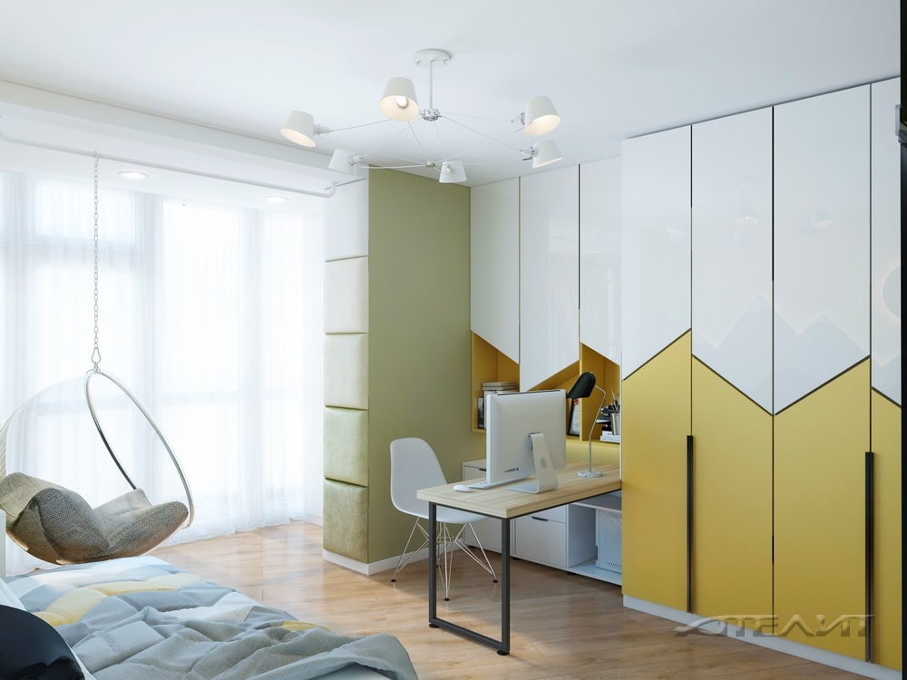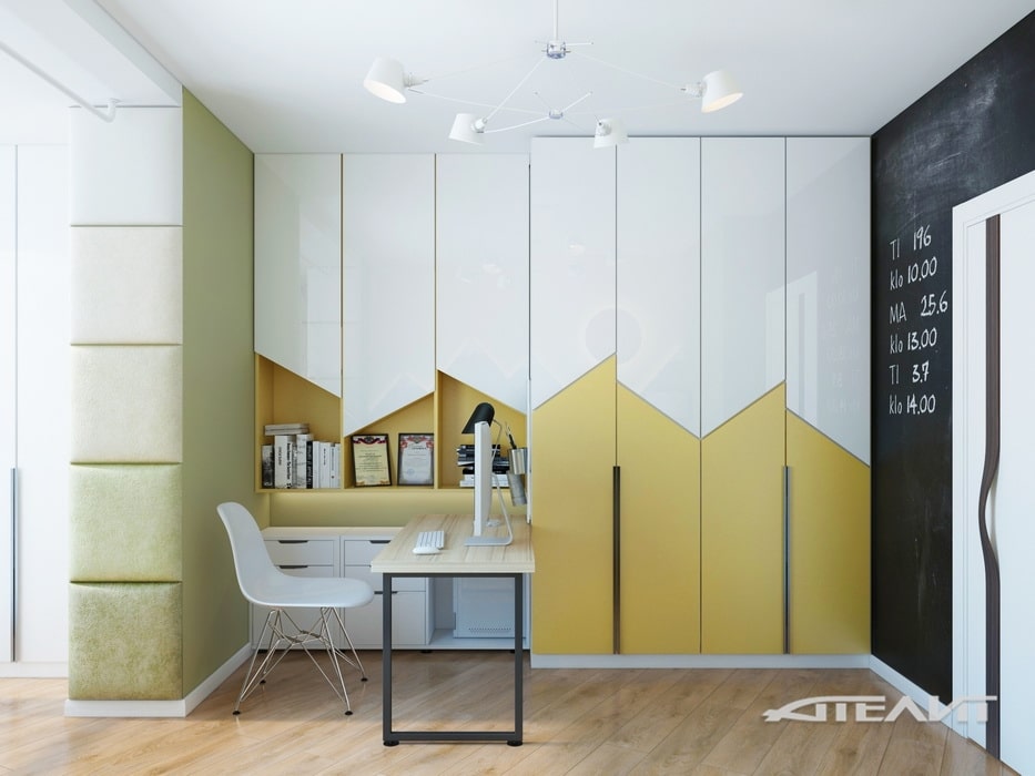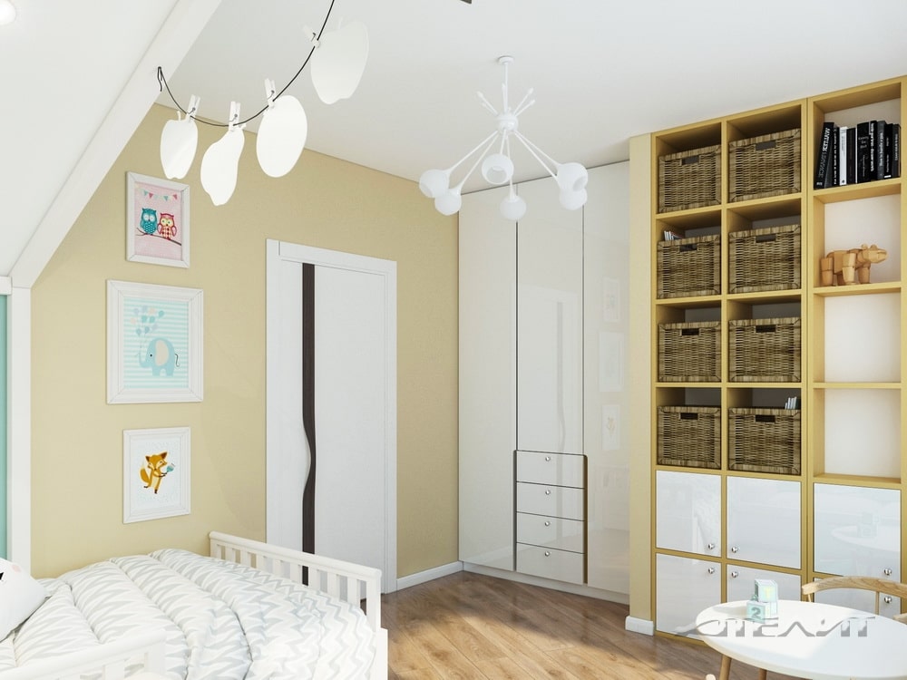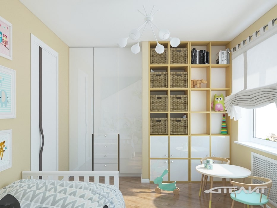 Эта детская комната для самого маленького члена семьи. Обратите внимание, как оборудовано спальное место, оно как будто находится в уютном домике. Встроенная мебель позволяет упорядочить одежду и многочисленные игрушки ребенка.