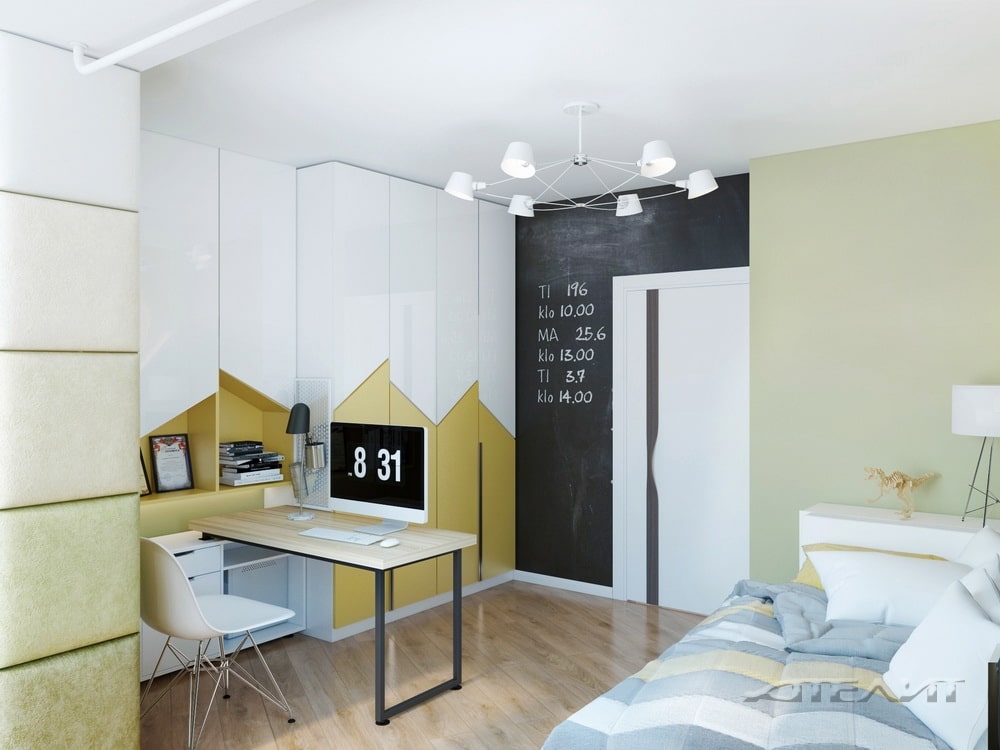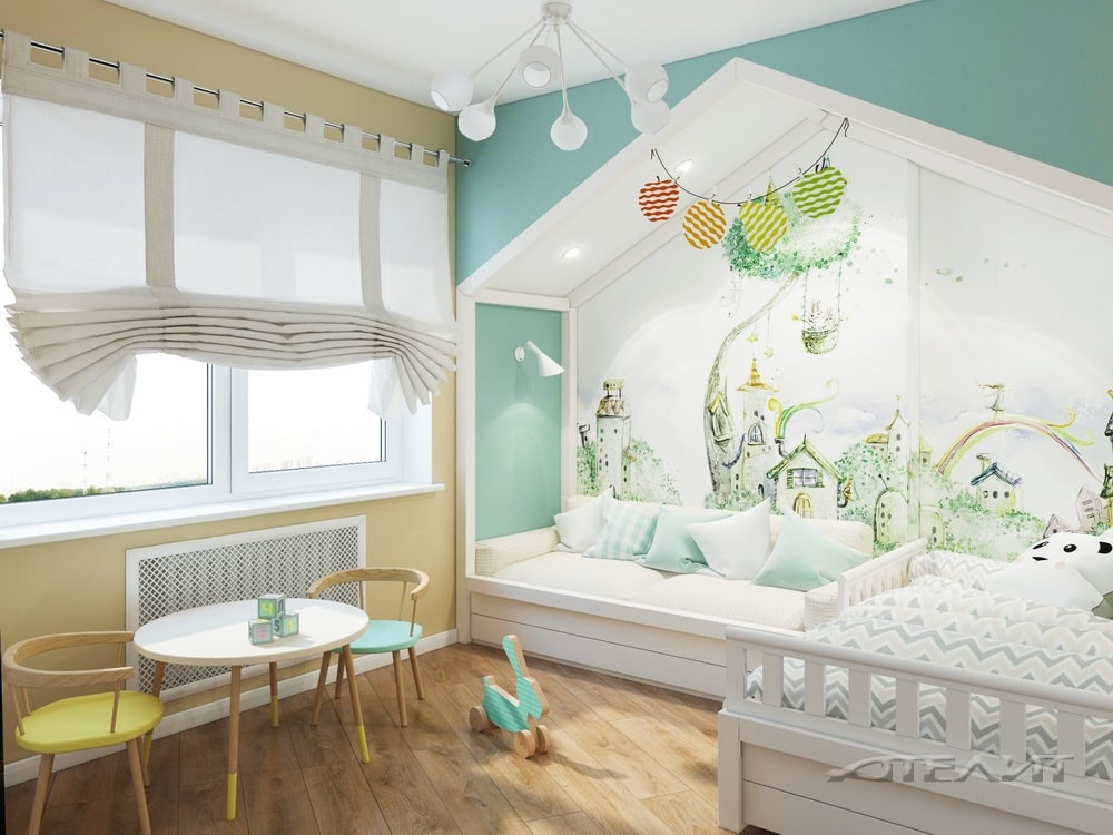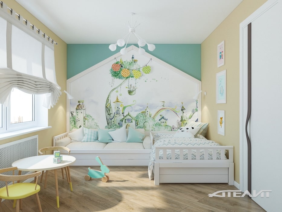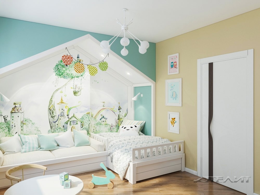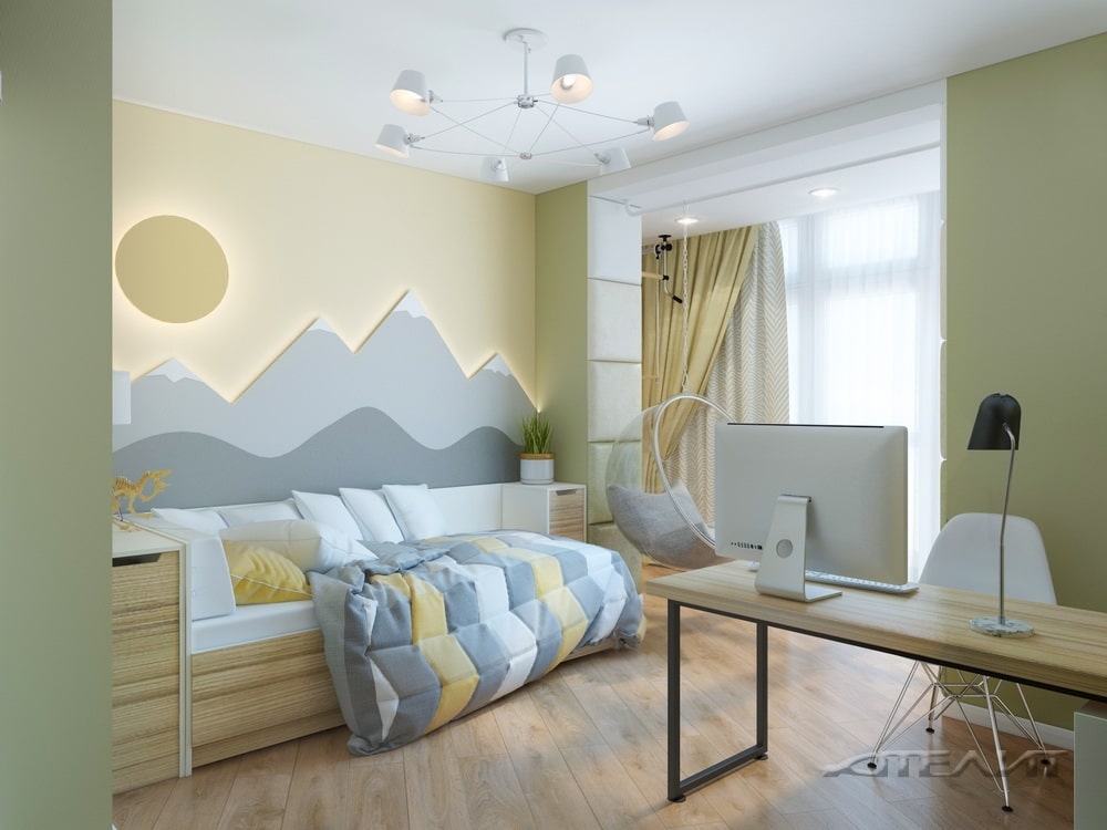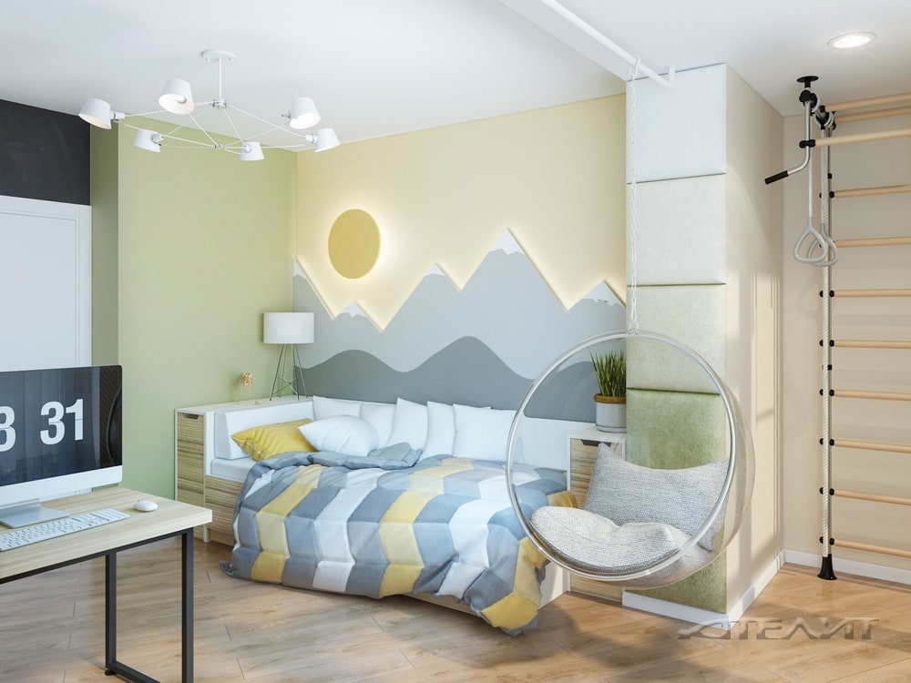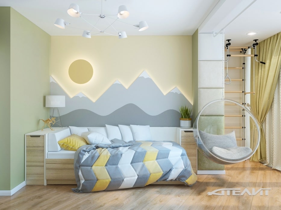 Тематика второй детской комнаты другая. На стену за спальным местом нанесен декоративный рисунок с изображением гор, моря и солнца. В комнате есть и доска для занятий, и спортивный уголок.