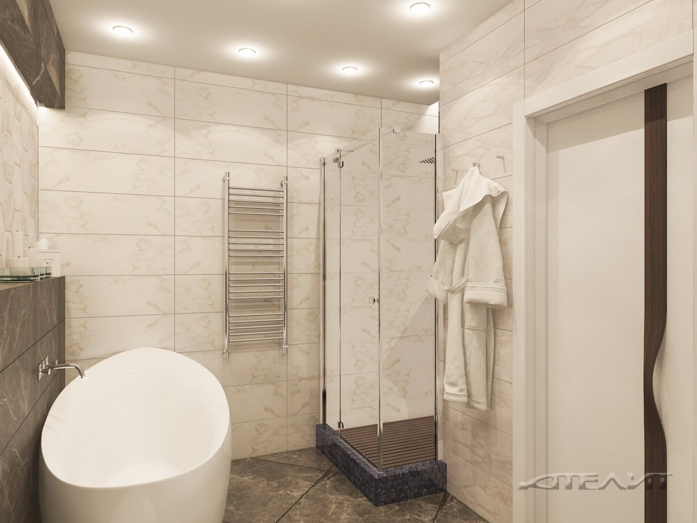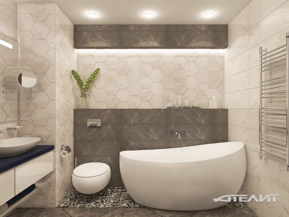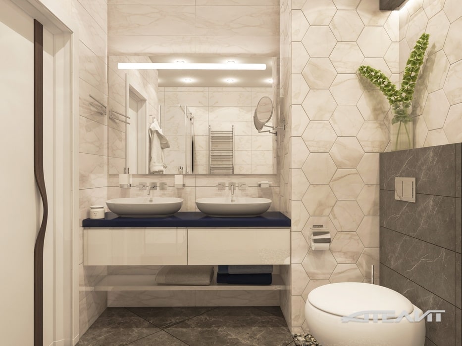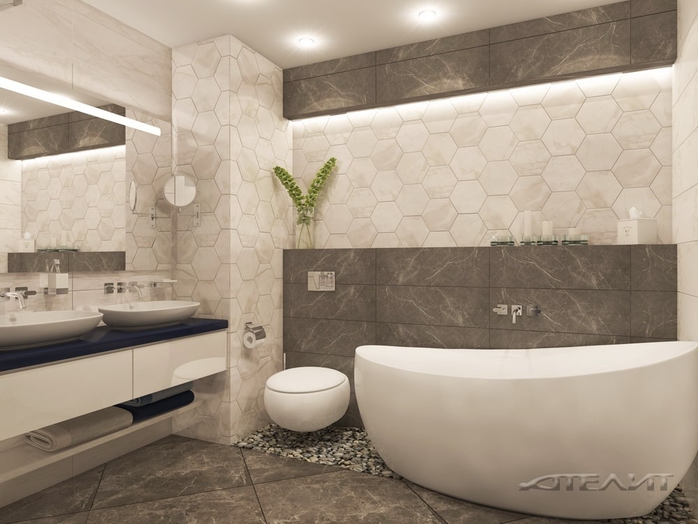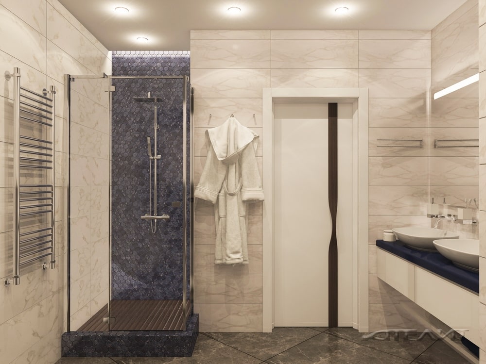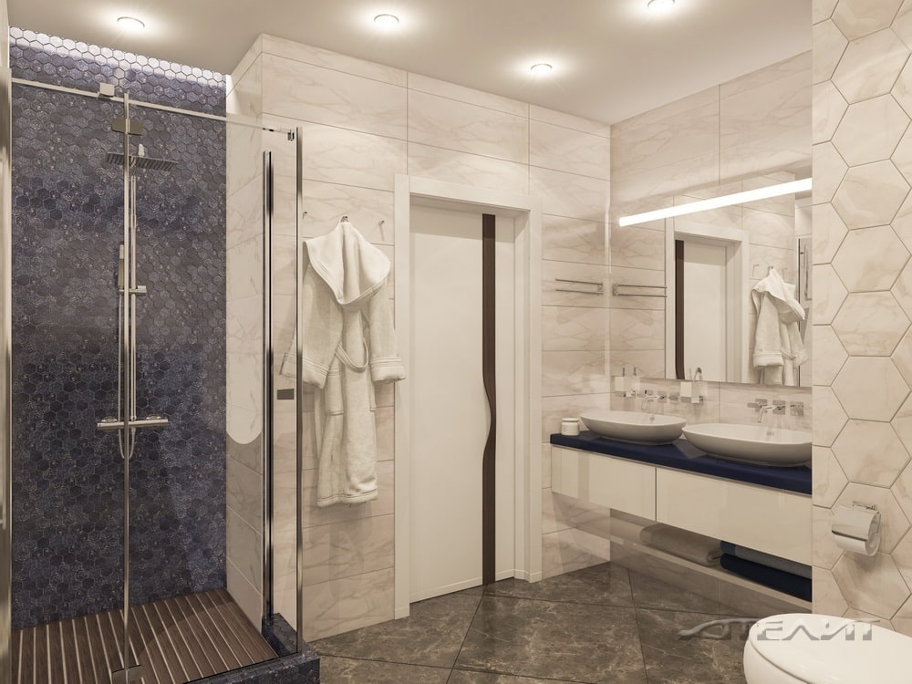 Душ, ванная, унитаз, тумба с двумя умывальниками – помещение получилось удобным и функциональным. Для отделки стен и пола использована плитка с имитацией мозаики и натурального камня.
