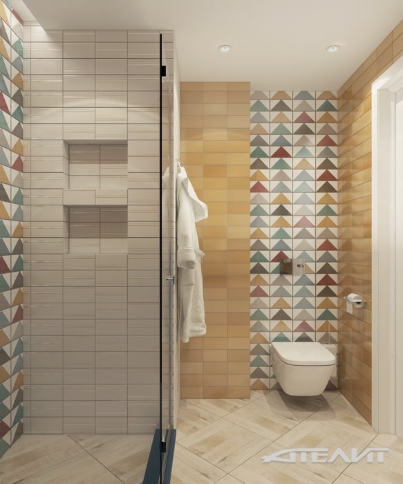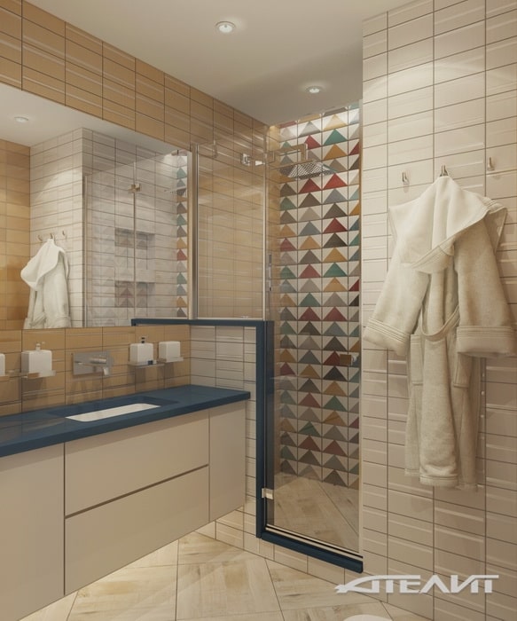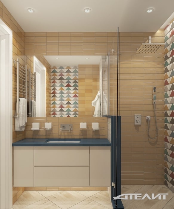 Душевая более светлая, здесь дизайнеры использовали три цвета – желтый, синий и белый. Из-за недостатка места от ванны решено отказаться в пользу душа.