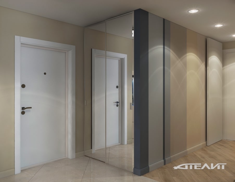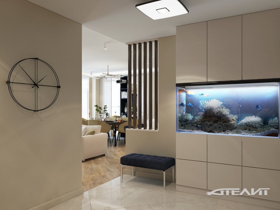 В прихожей оборудован вместительный шкаф-купе и аквариум с подсветкой.