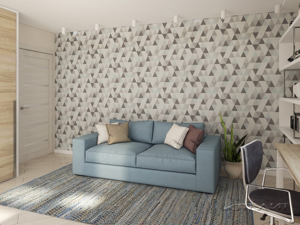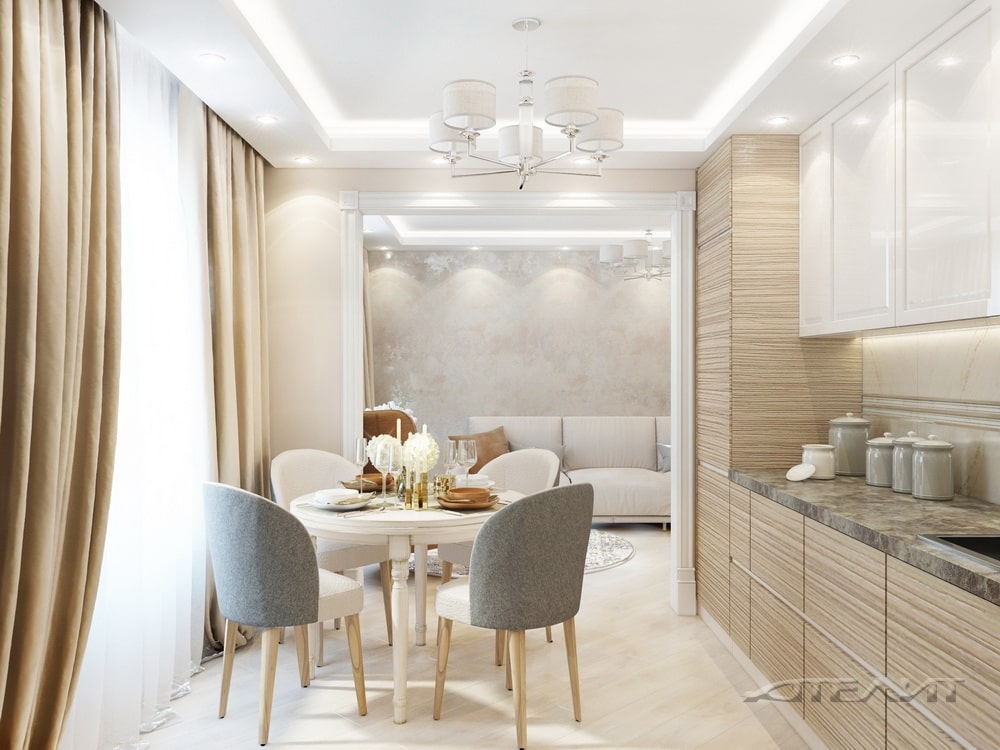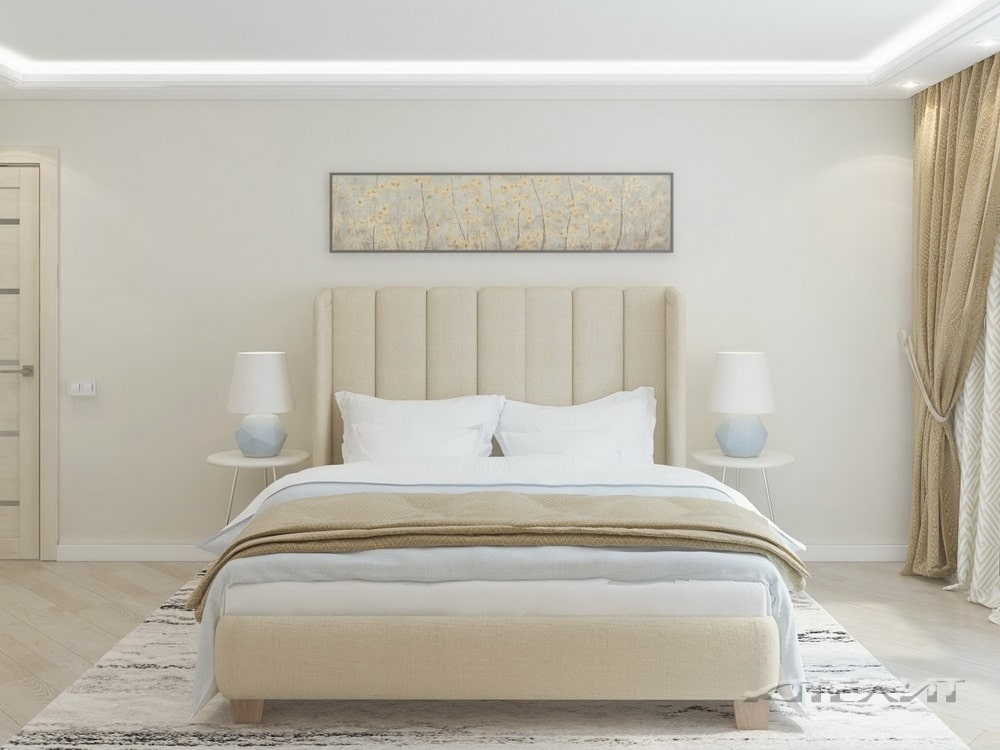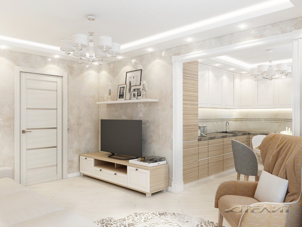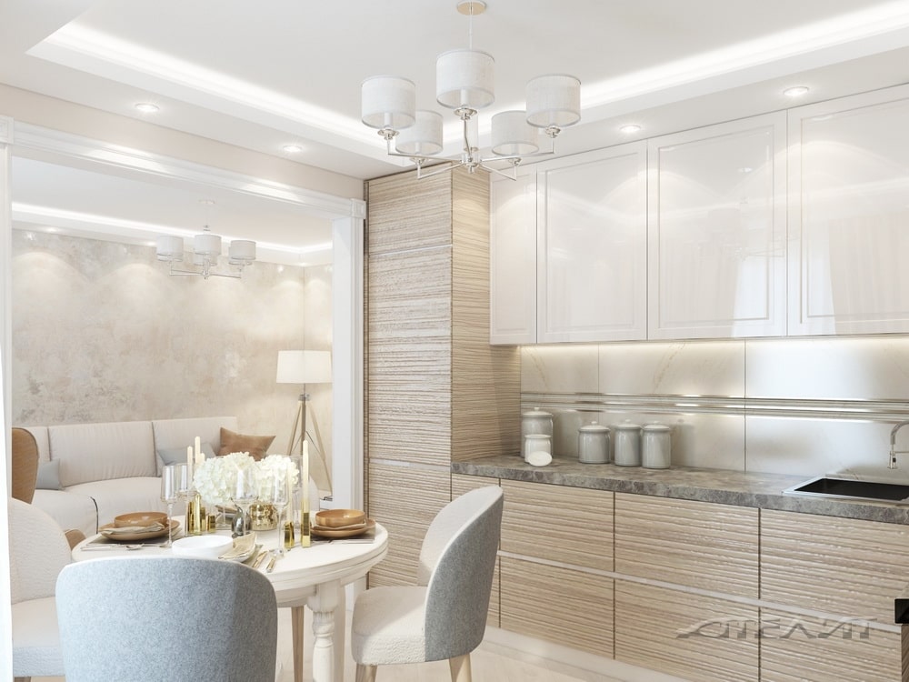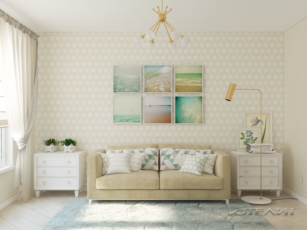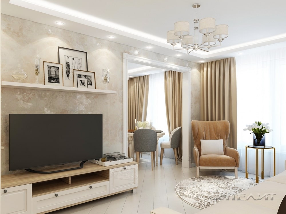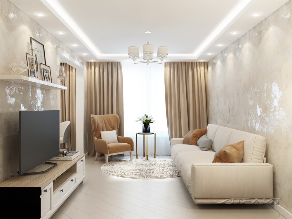 Гостиная выполнена в светлых тонах и разбавлена песочными акцентами. Такое сочетание цветов привносит в атмосферу уют и тепло. Способствует этому и мягкий рассеивающий свет, который излучают светодиодные лампы на комбинированном потолочном покрытии.