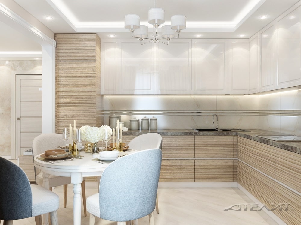 Угловая кухня со встроенной бытовой техникой делает комнату упорядоченной и аккуратной. Здесь нет ничего лишнего, но есть все необходимое, чтобы порадовать семью вкусным обедом и приятно провести время в теплом кругу близких людей.