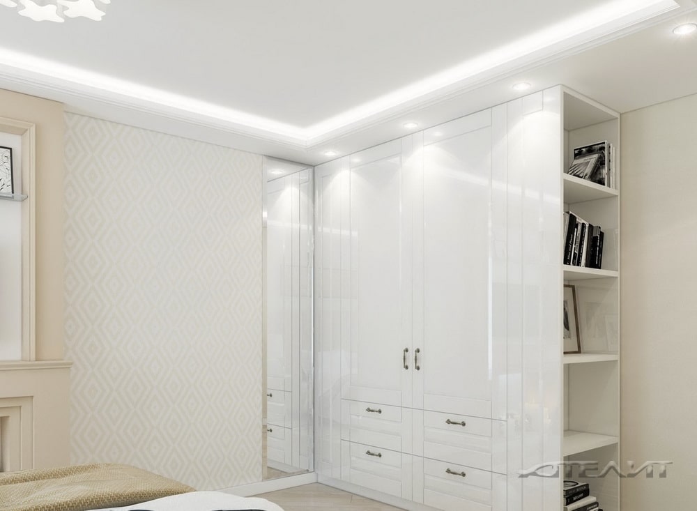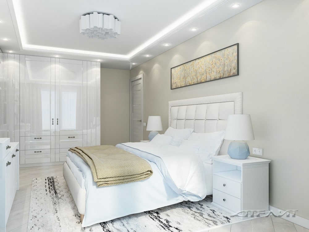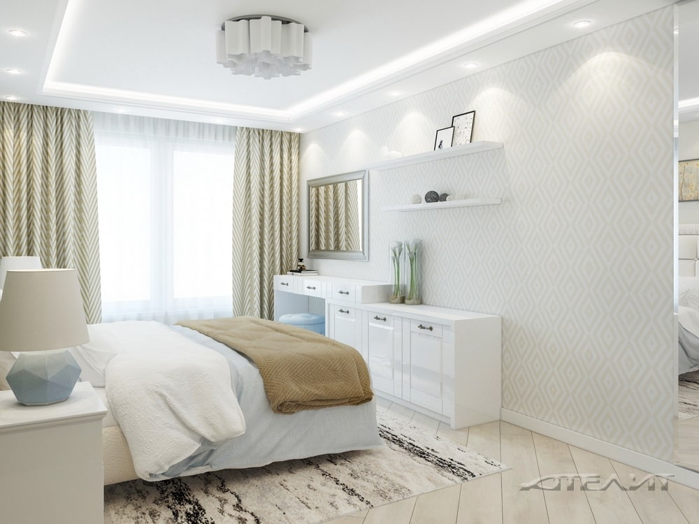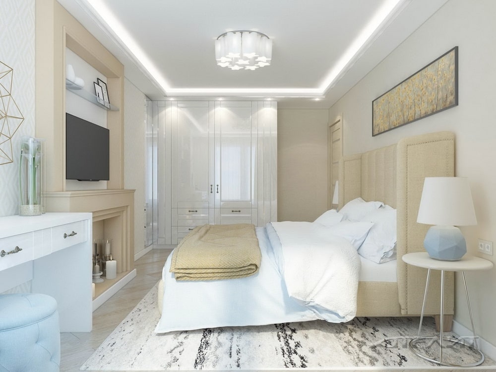 Для спальни разработали два варианта интерьера: первый со столиком и декоративной конструкцией, внутри которой идеально вписался телевизор, второй — со столиком, зеркалом и комодом.