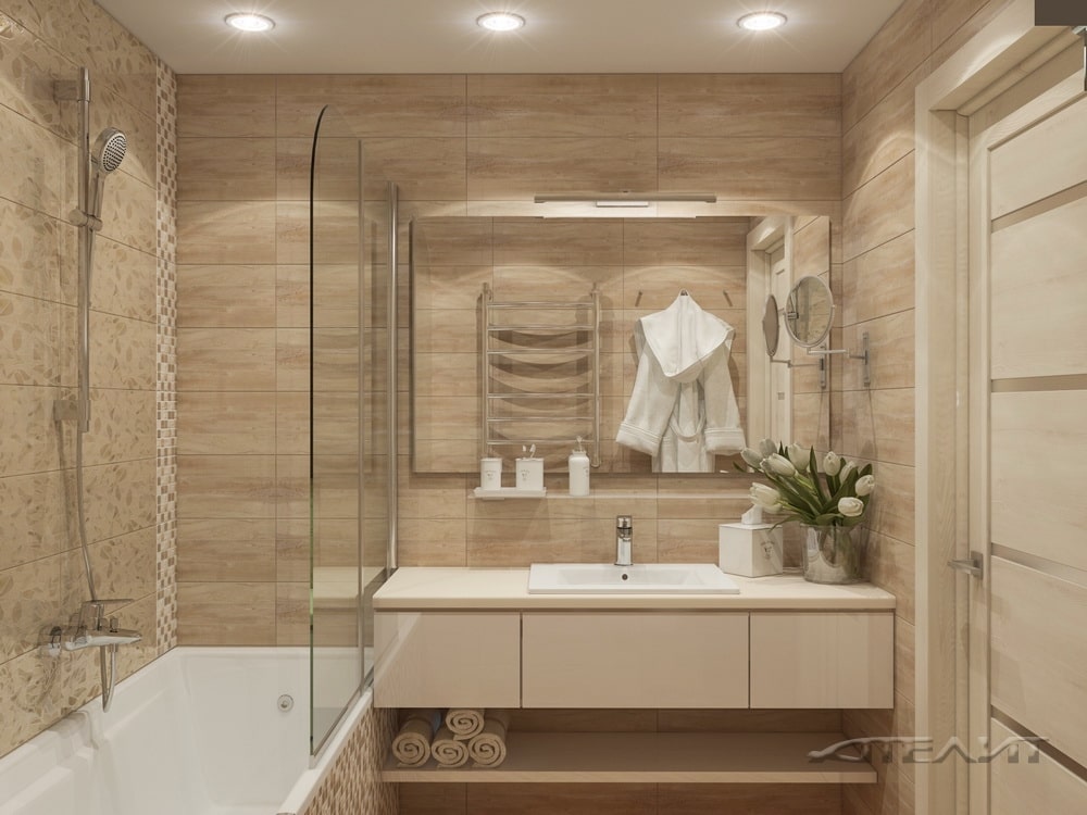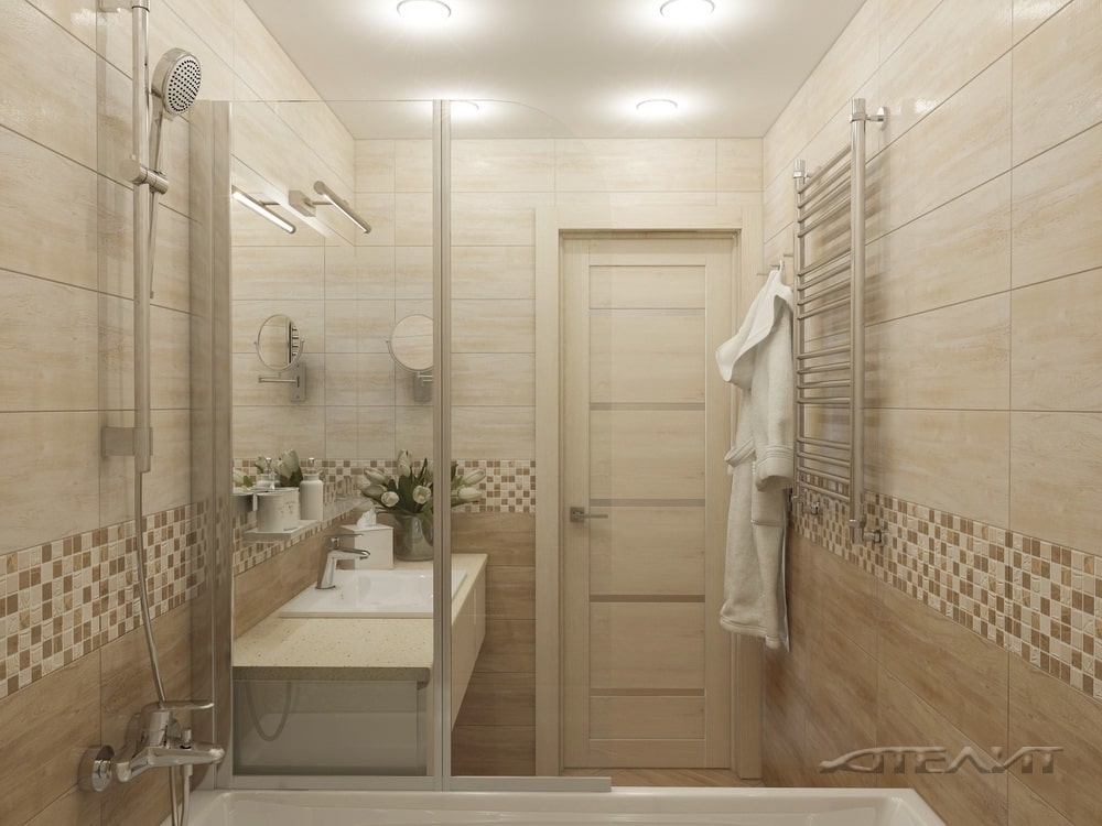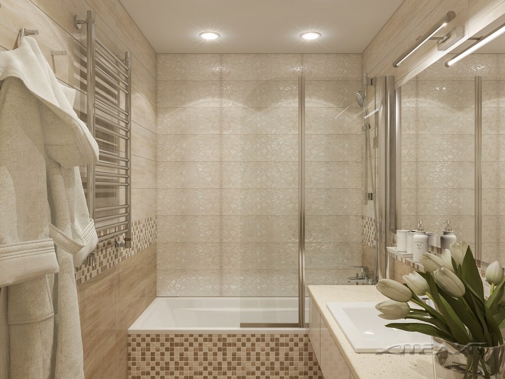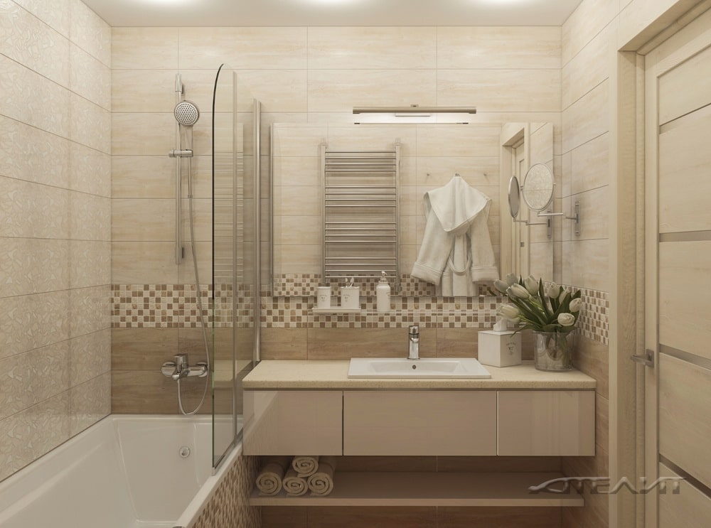 На стенах и полу плитка с декоративными вставками. Чтобы вода во время ванных процедур не разбрызгивалась и не попадала на зеркало, предусмотрена стеклянная перегородка.