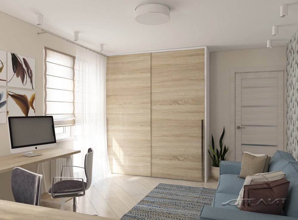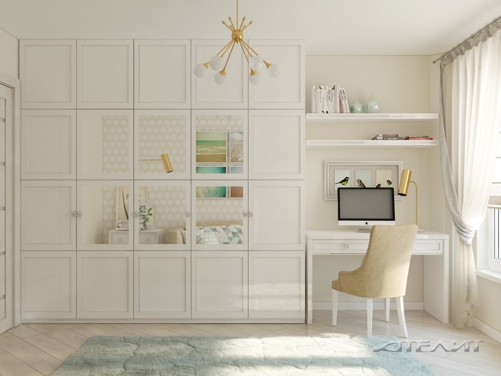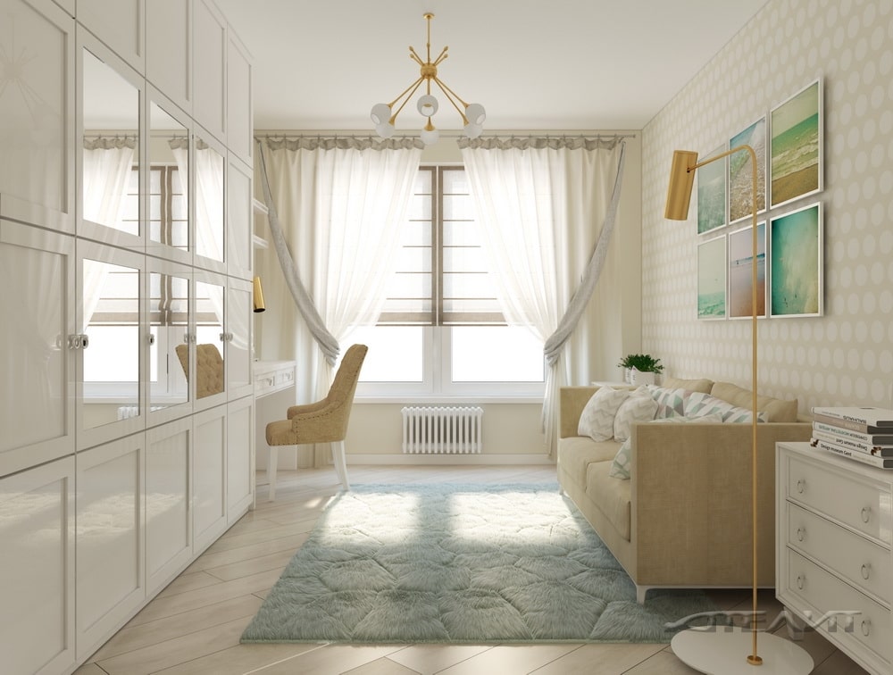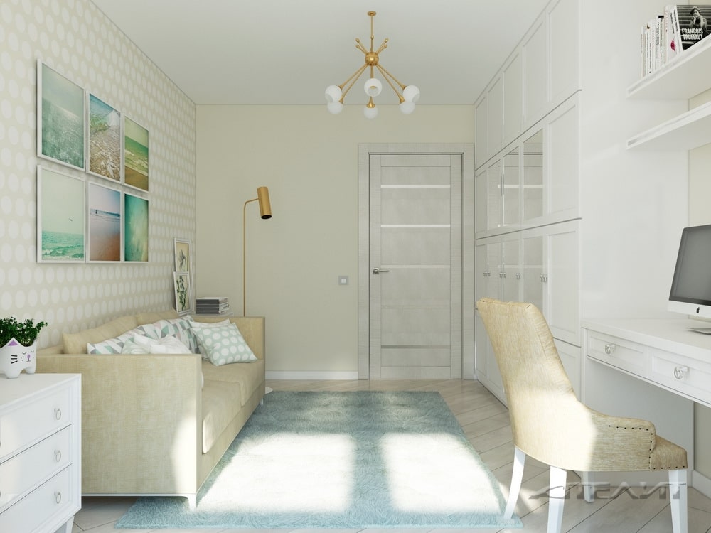 Комната оформлена в светлых тонах, за счет чего выглядит очень просторной. Удобный диван, зона для учебы, многосекционный шкаф – дизайнеры предусмотрели все необходимое, чтобы ребенку был комфортно.