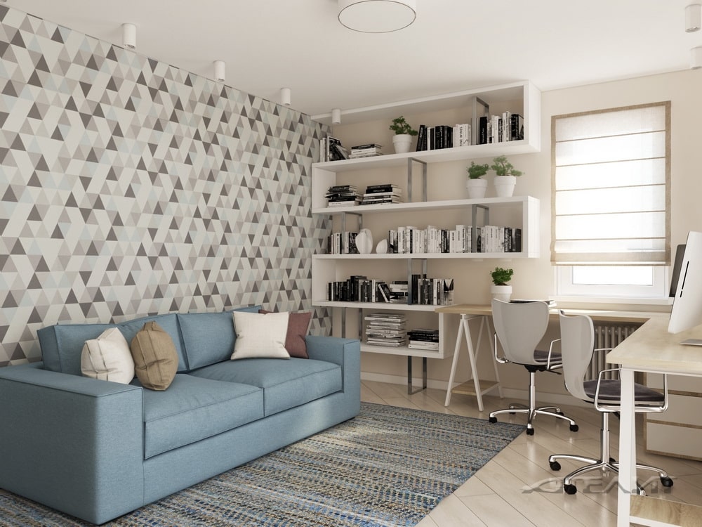 За фигурным угловым столом одновременно могут работать несколько человек. Обратите внимание на оригинальный подход к оформлению полок для книг и документов. Есть в кабинете и место для отдыха. Если засиделись допоздна, можно немного передохнуть.