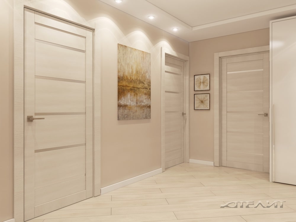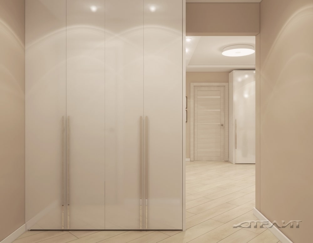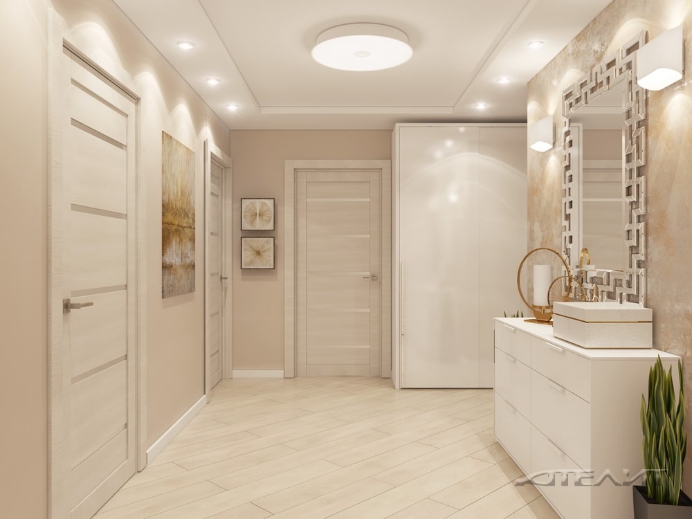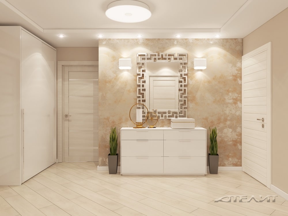 Прихожая просторная. Дизайнеры решили оставить ее такой, избежав перенасыщения мебелью. Два двухсекционных шкафа, комод и зеркало — этого хватило, чтобы создать в помещении уют.