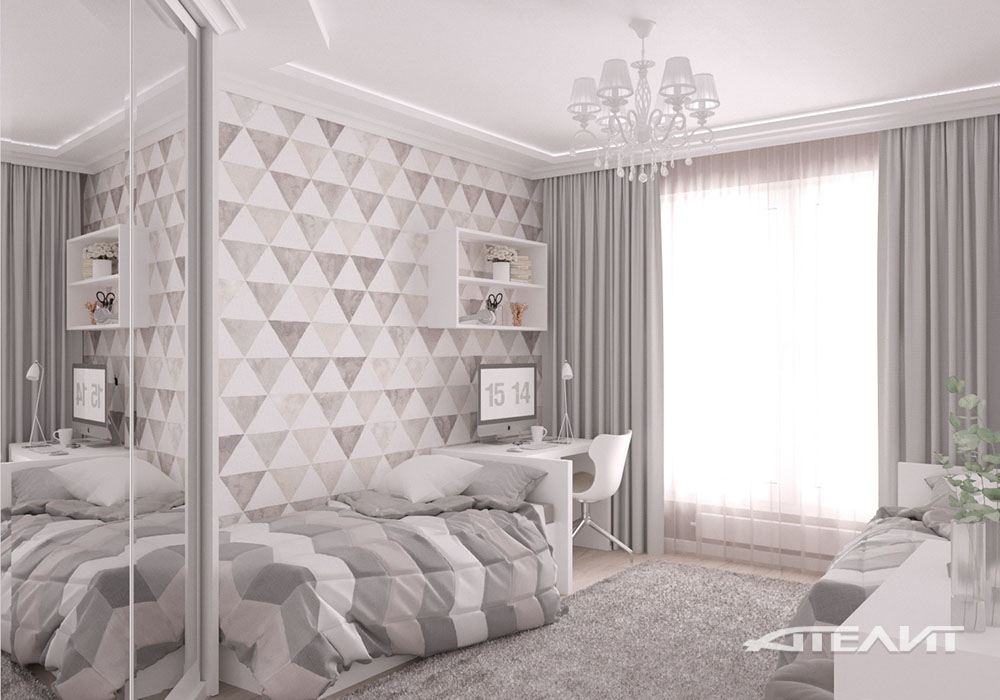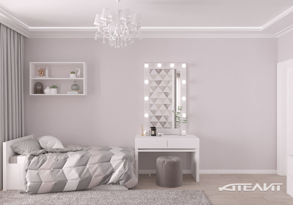 Для интерьера детской была выбрана собственная цветовая гамма, уходящая в нежную лилово-бежевую тональность. В сочетании с белой мебелью это создает ощущение легкости и нарядности, что так важно было для будущих юных обитательниц.