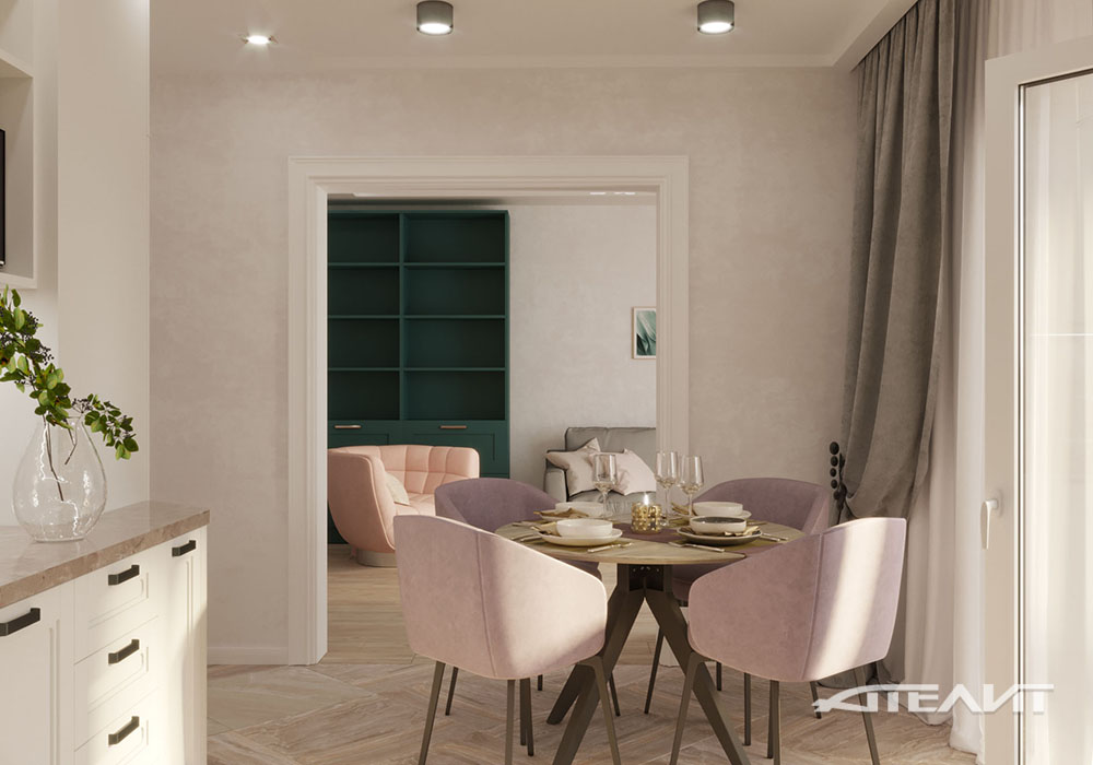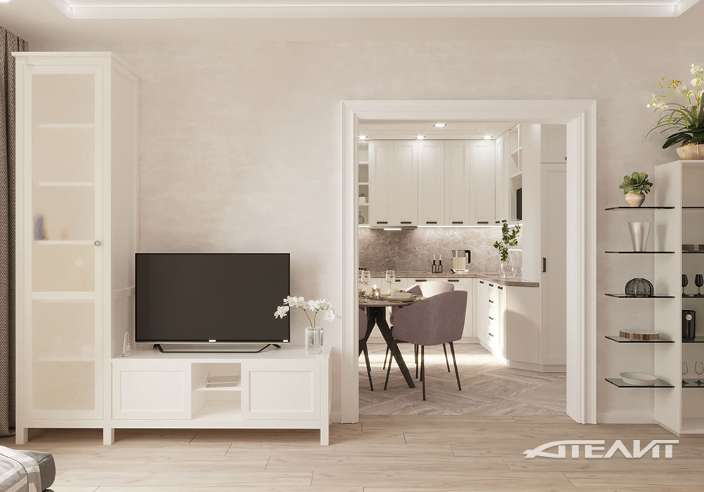 Кухня и гостиная – смежные помещения, объединенные общим широким проемом – выполнены в едином стиле. На кухне размещена небольшая обеденная зона, а в гостиной – комфортная зона ТВ и шкафы-витрины с открытыми полками.