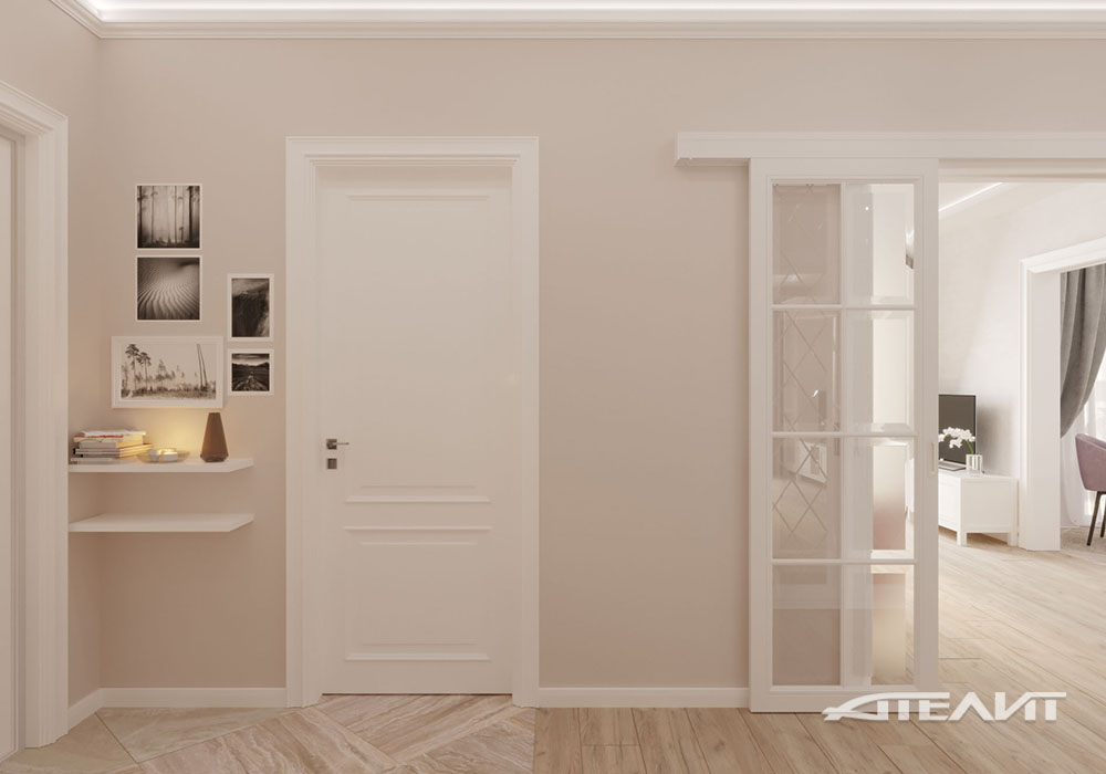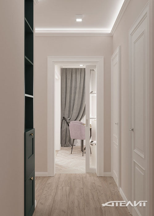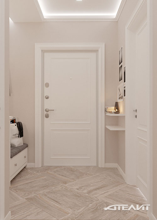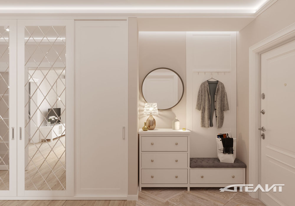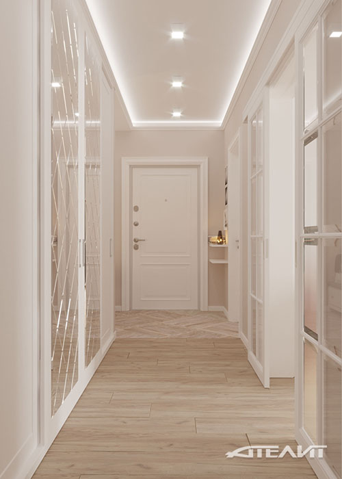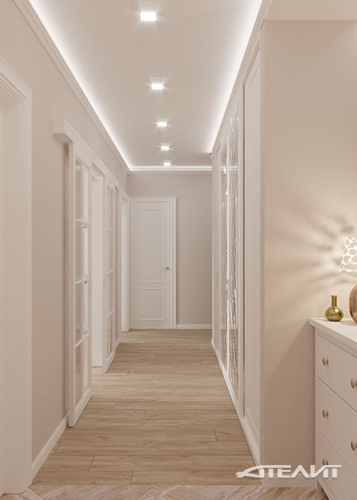 Преобладание теплых кремовых тонов в отделке стен, декоративная штукатурка Ottocento с мягкой шелковой фактурой и светлая мебель делают эту большую квартиру для семьи из четырех человек невероятно теплой и уютной. Планировка позволила разместить здесь две больших спальни, гостиную, совмещенную с кухней благодаря широкому проему, а также весьма вместительные шкафы, расположенные по всей протяженности коридора.