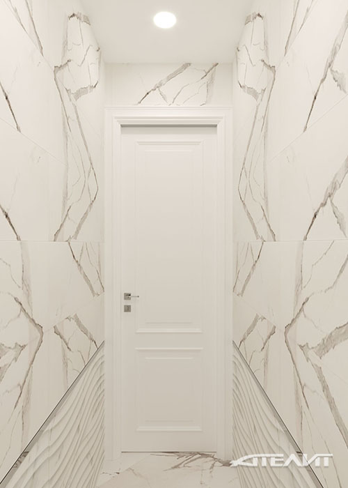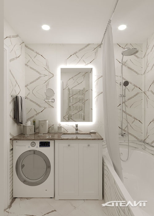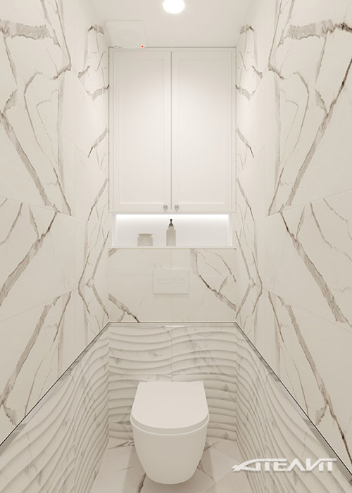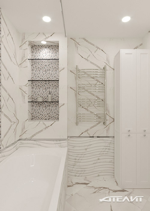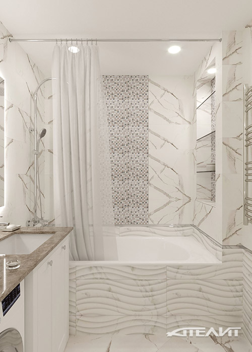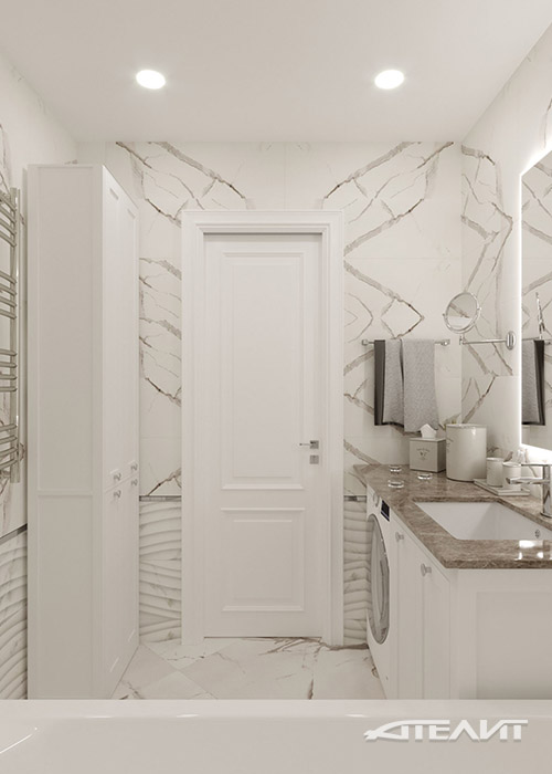 В санузлах использована керамическая плитка, имитирующая фактуру мрамора, столешница из натурального камня бежевого тона, а также объединяющие их композиционно, вставки из керамической мозаики.