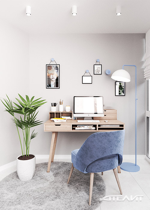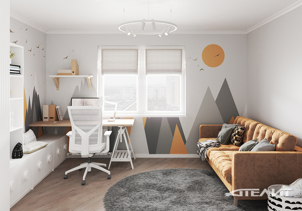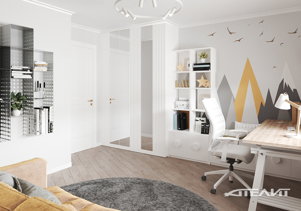 В интерьере детской преобладают светлые тона, разбавленные легким ненавязчивым декором на стенах, благоприятствующим как для отдыху, так и учёбе.