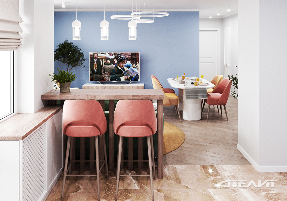 Кухня и гостиная традиционно объединены в общее пространство, условно зонированное за счет соответствующего размещения мебели, различных напольных покрытий и правильного использования контуров самого помещения.